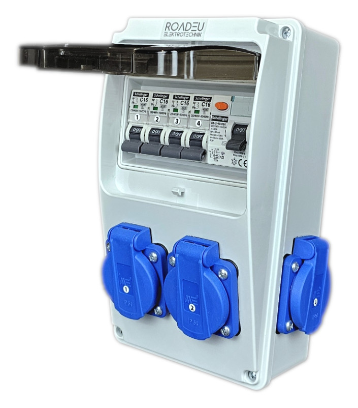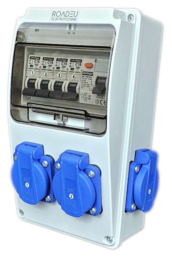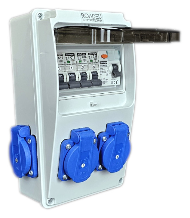 230V-Verteiler mit 4 Steckdosen 230V 16A, 4 Schutzschaltern C 16A 1P, Fehlerstromschutzschalter 40A 2P Typ A/AC