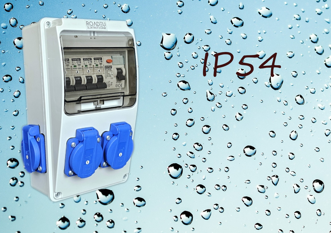 230V-Schaltschrank mit Sicherungen. Vier Steckdosen 230V 16A. IP54