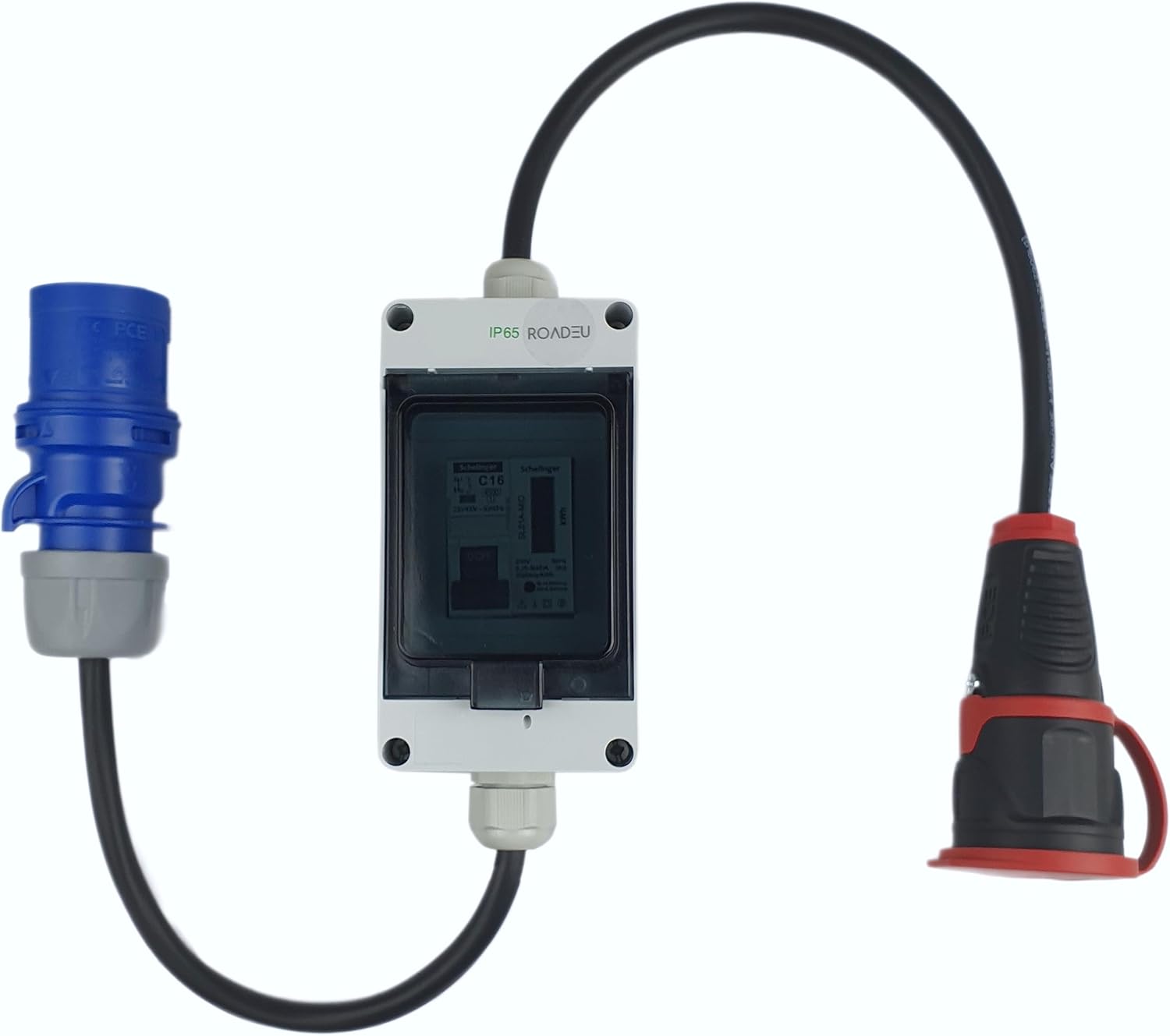 TECHNISCHE DATEN: CEE-Stecker 16A 230V – Steckdose 230V – Kabel 3×2 5 mm. Länge: 1 m – Gummikabel – abriebfest, stoßfest, quetschfest, beständig gegen Fette und Mineralöle. Max 3600 Watt.