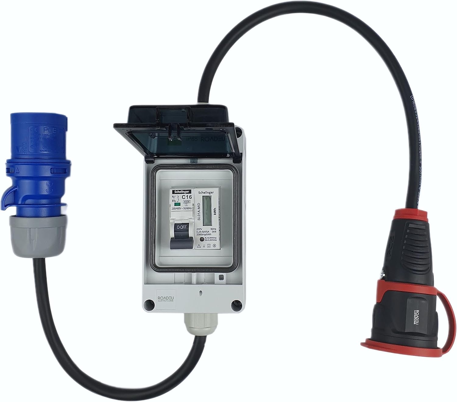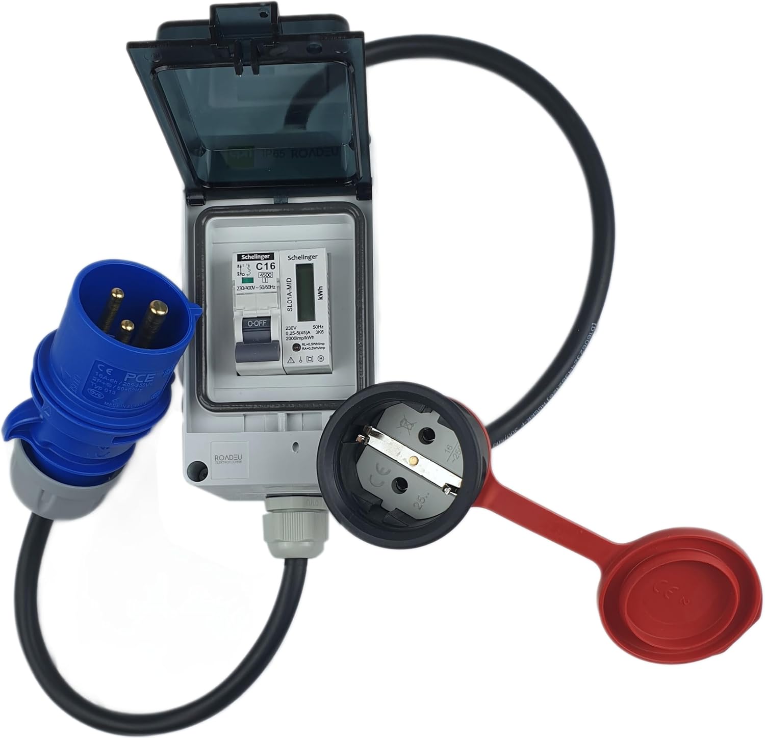 Adapter für Caravan – CEE-Stecker 3P 16A auf Buchse 230V – Kabel 3×2 5mm2 – Verlängerung 1 Meter mit Stromzähler. IP44