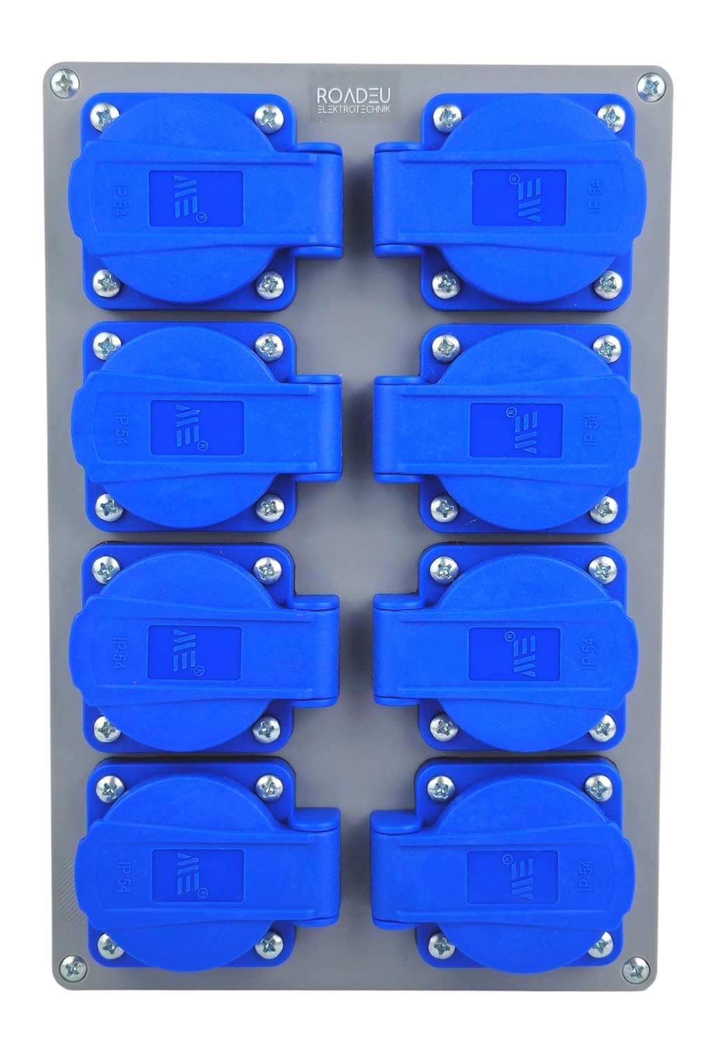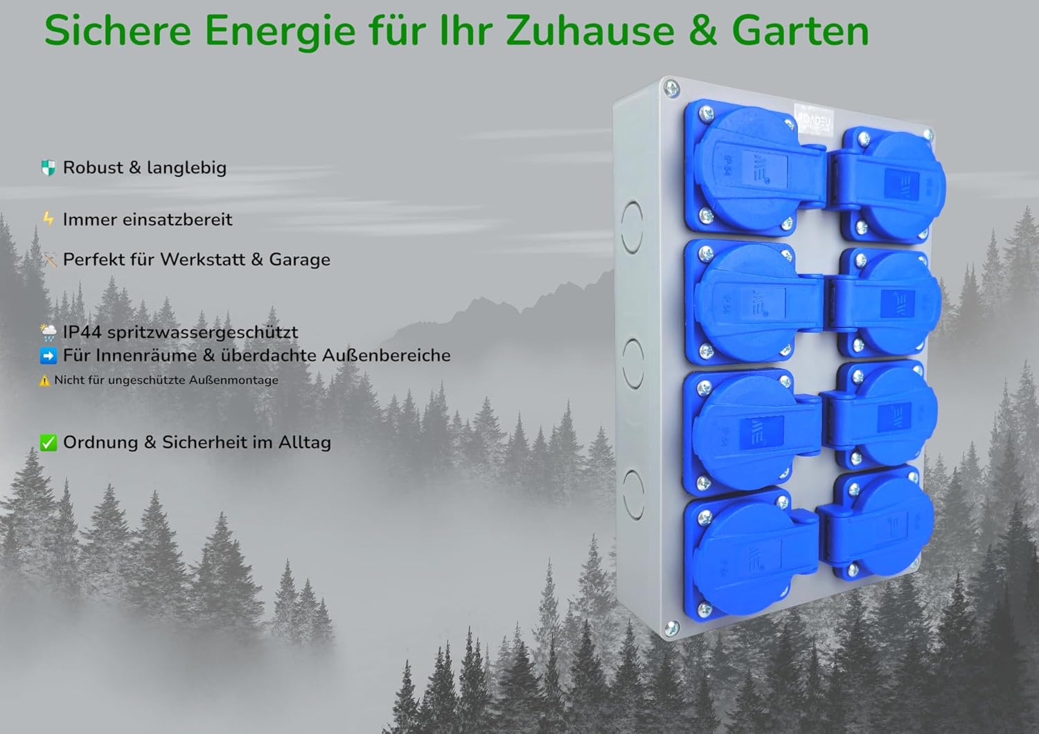 ⚡ 8 Schuko-Steckdosen für Werkstatt & Garten – Anschlussbereit mit 8x 230V / 16A. Kompatibel mit Standard- und Winkelsteckern, ideal für Werkzeuge und Gartengeräte.