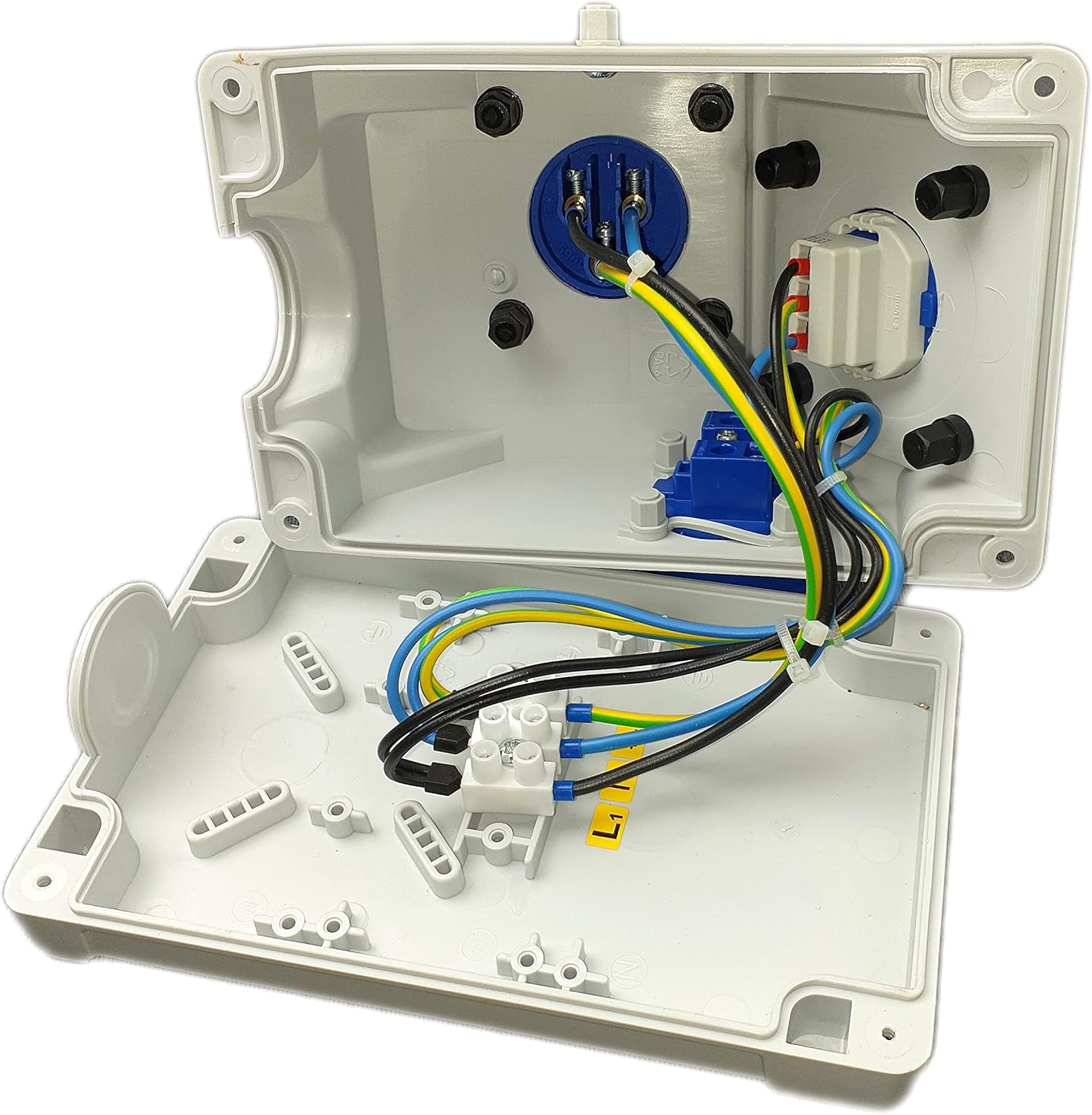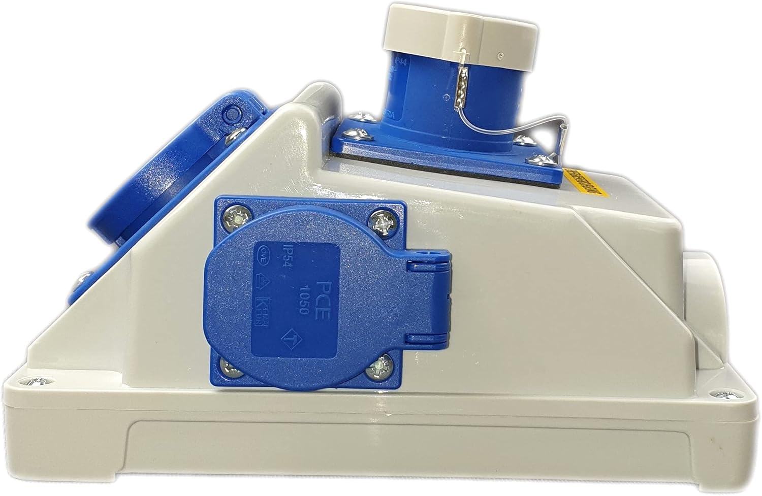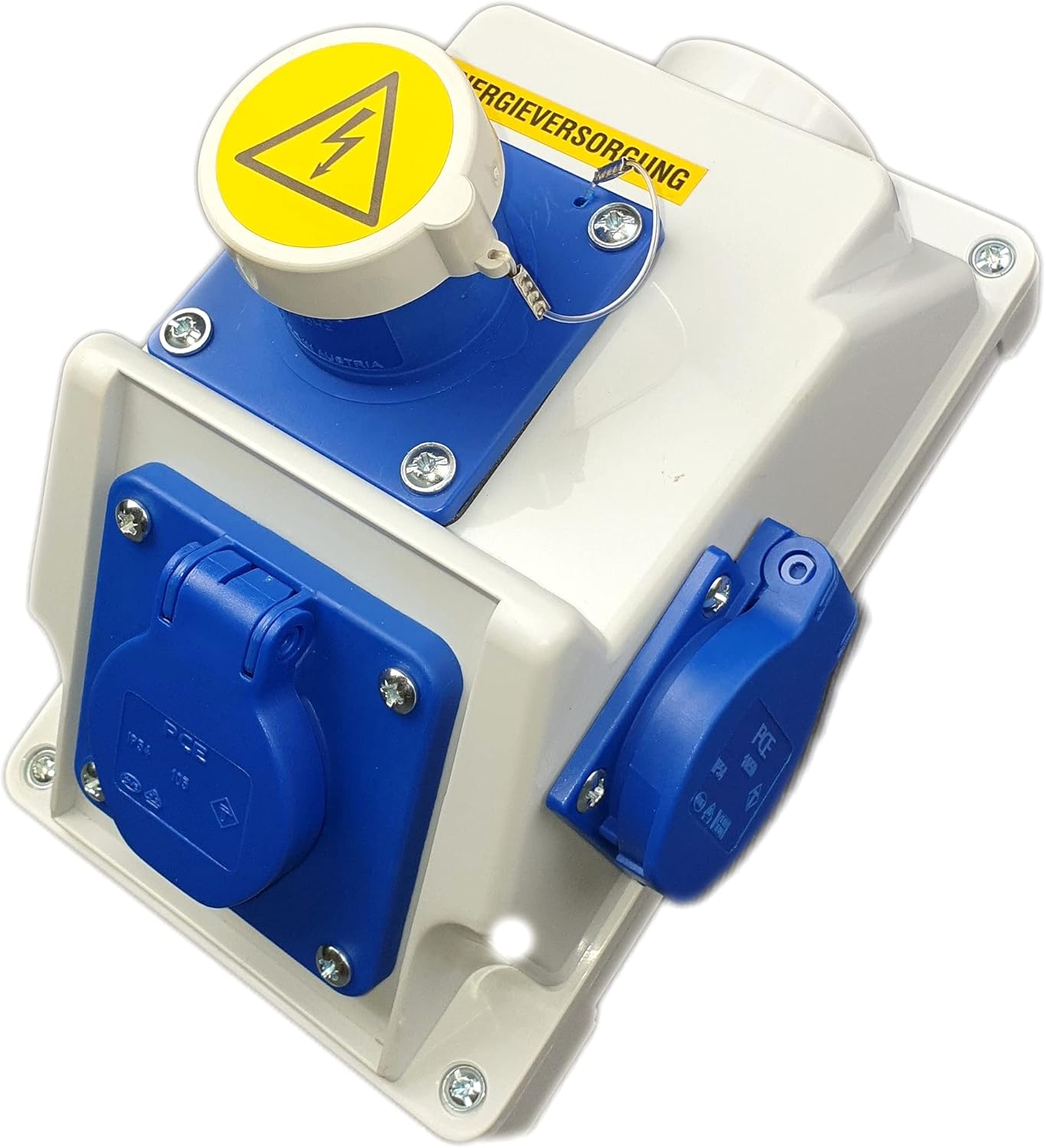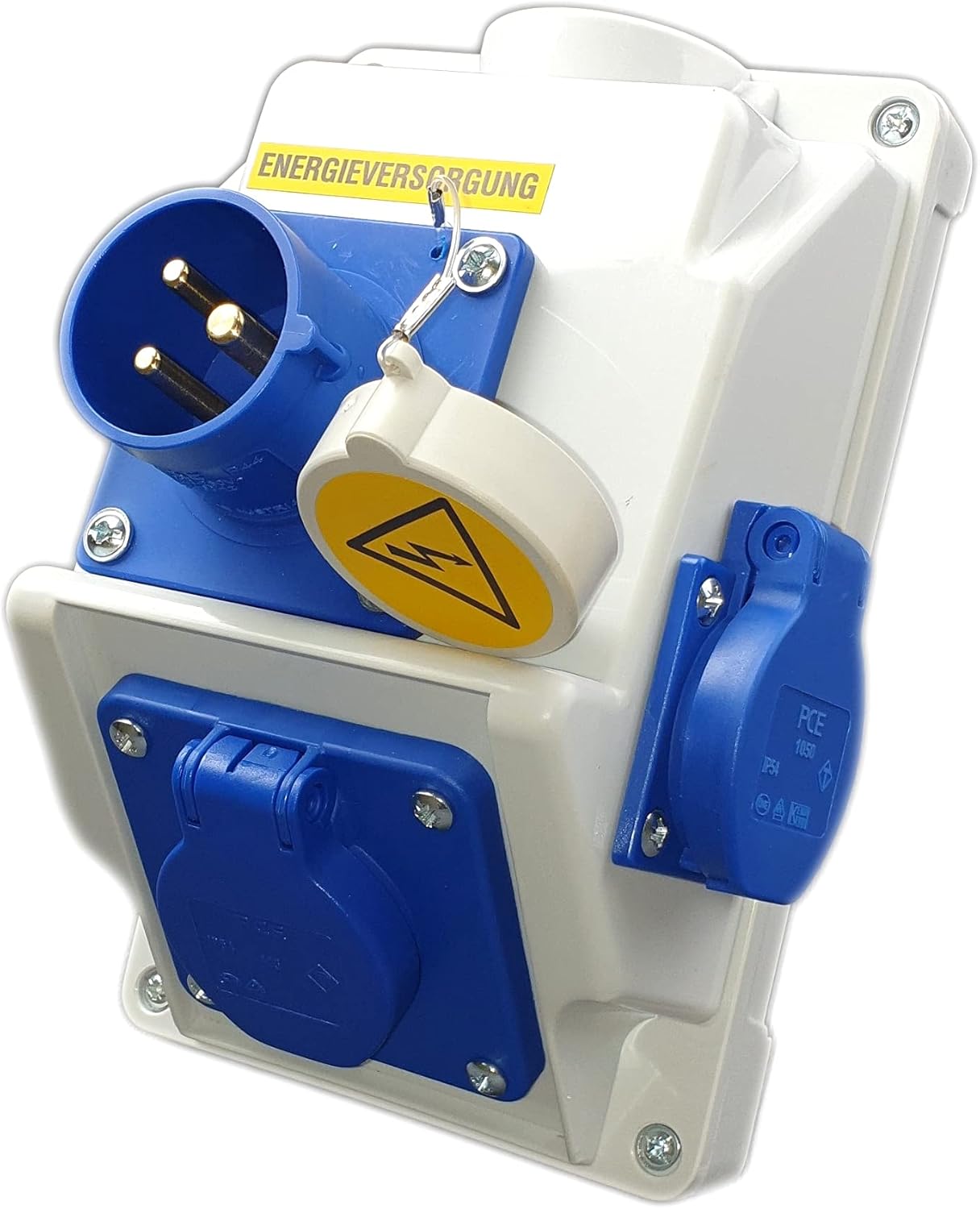 Des Weiteren bietet er zwei Schuko PCE Steckdosen mit einer Leistung von 16A und einer Spannung von 230V.
