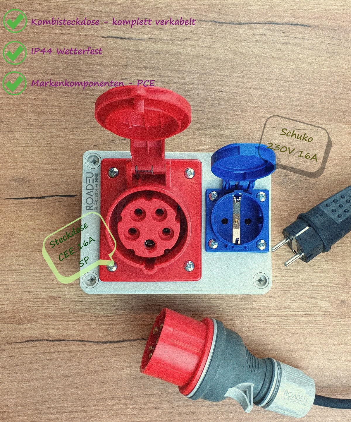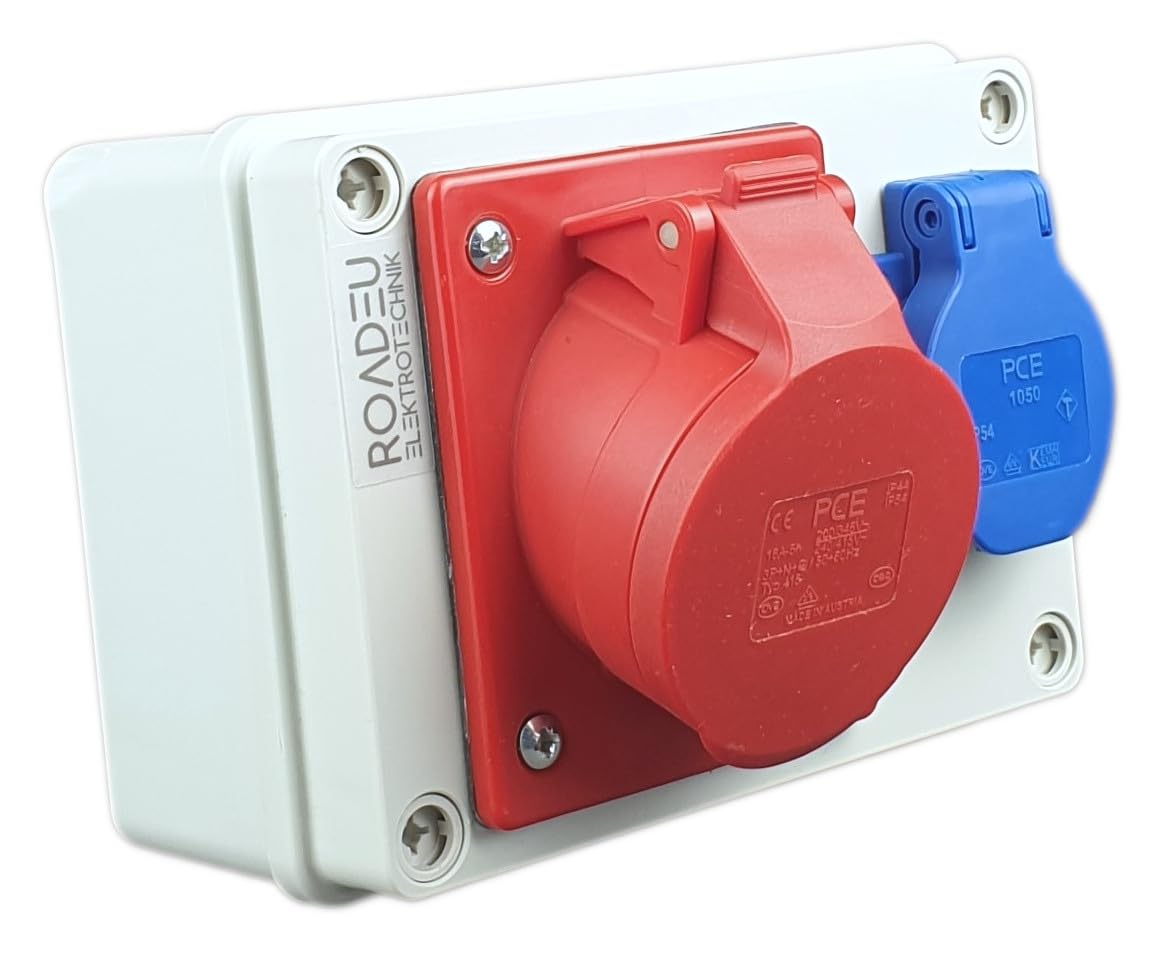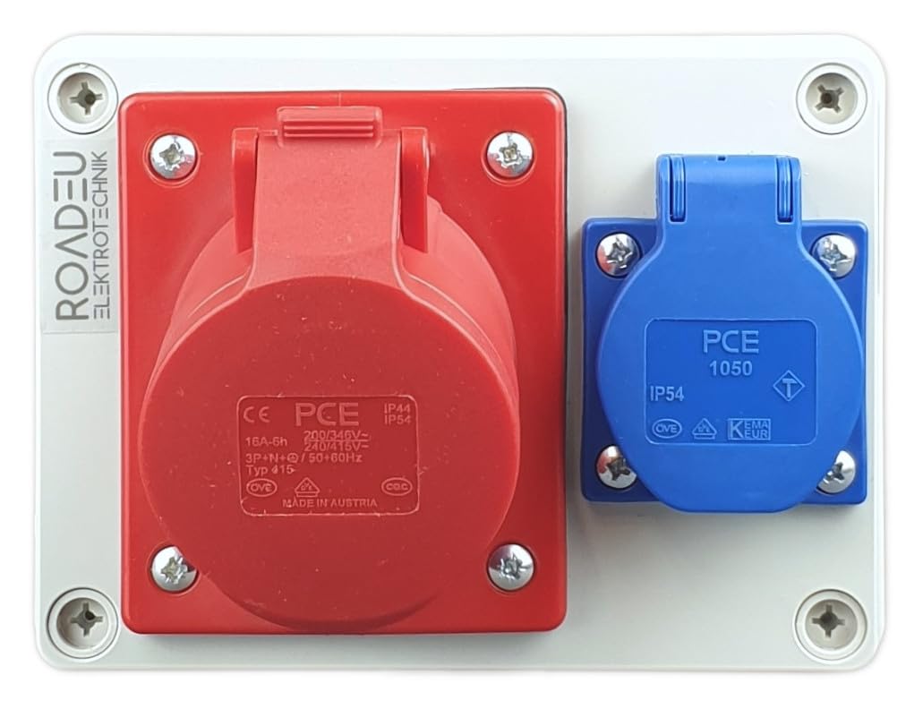 Hochwertige PCE Außensteckdose (Österreichische Produktion) 380/415V und Schuko 230V – Komponenten von uns CEE Verteiler.