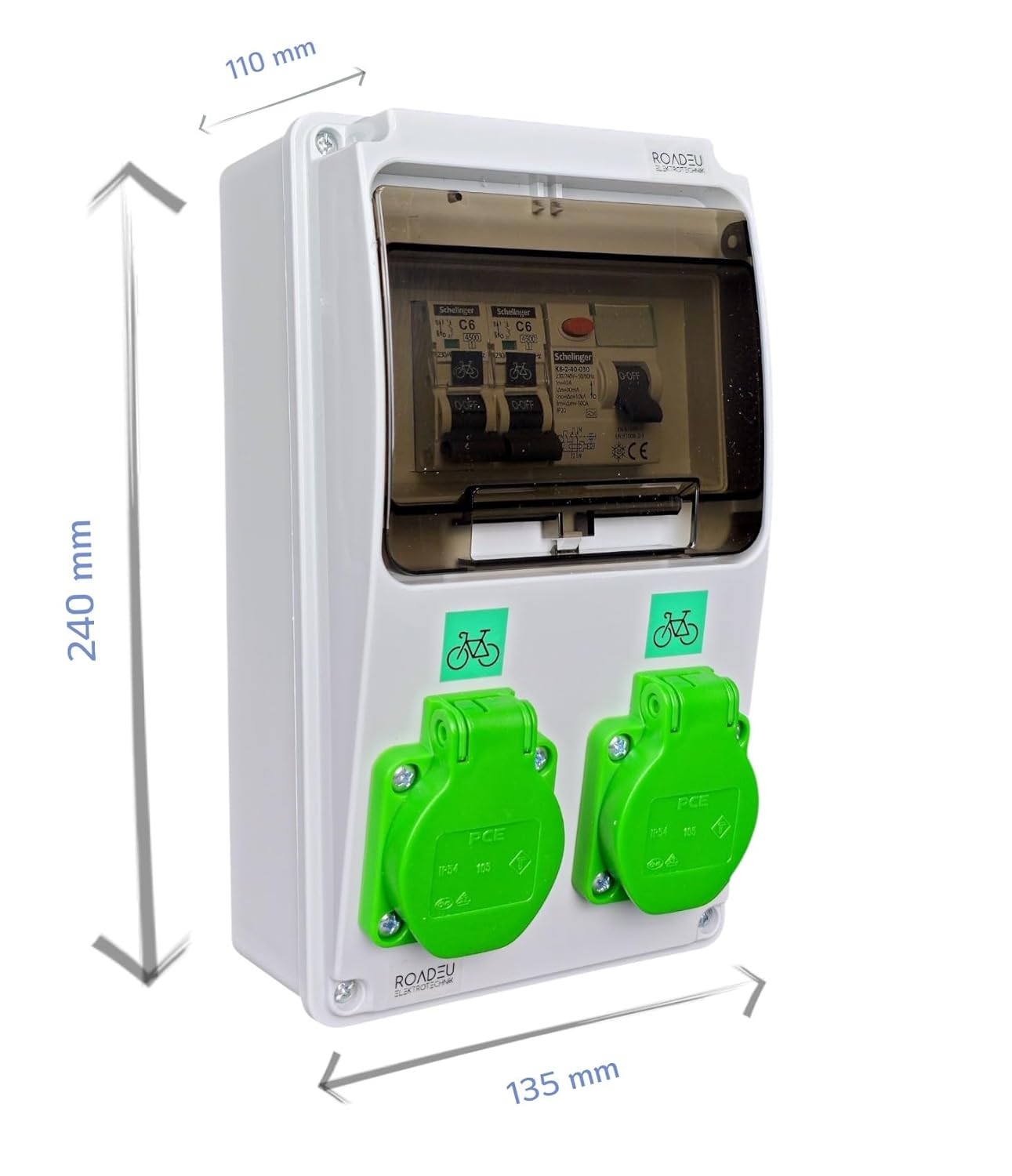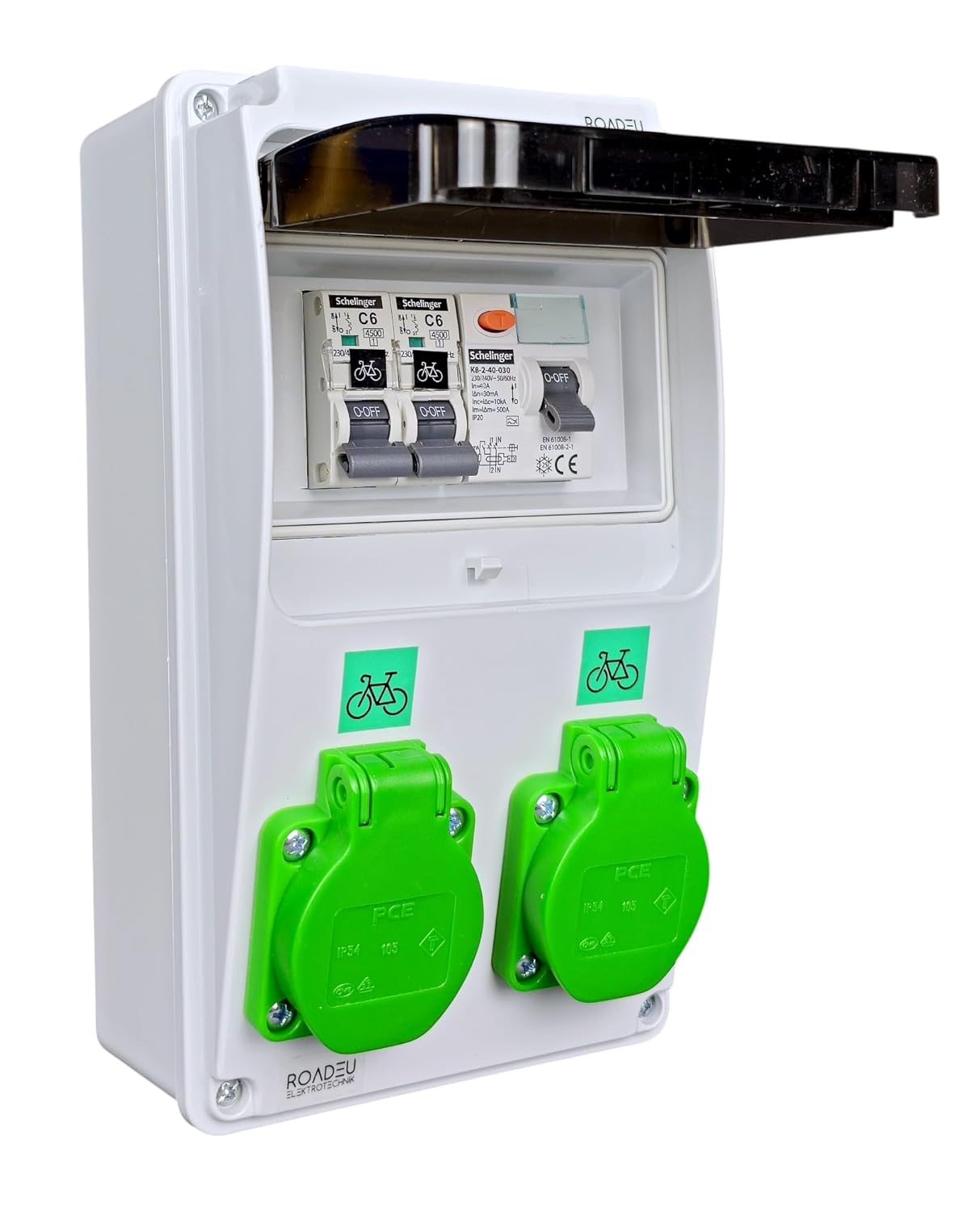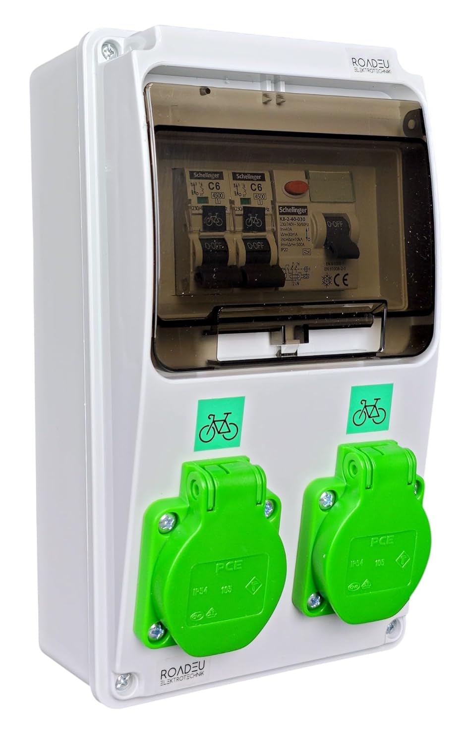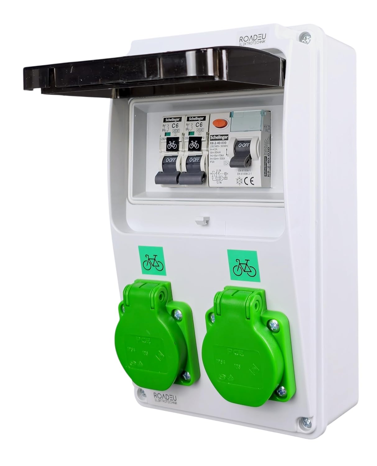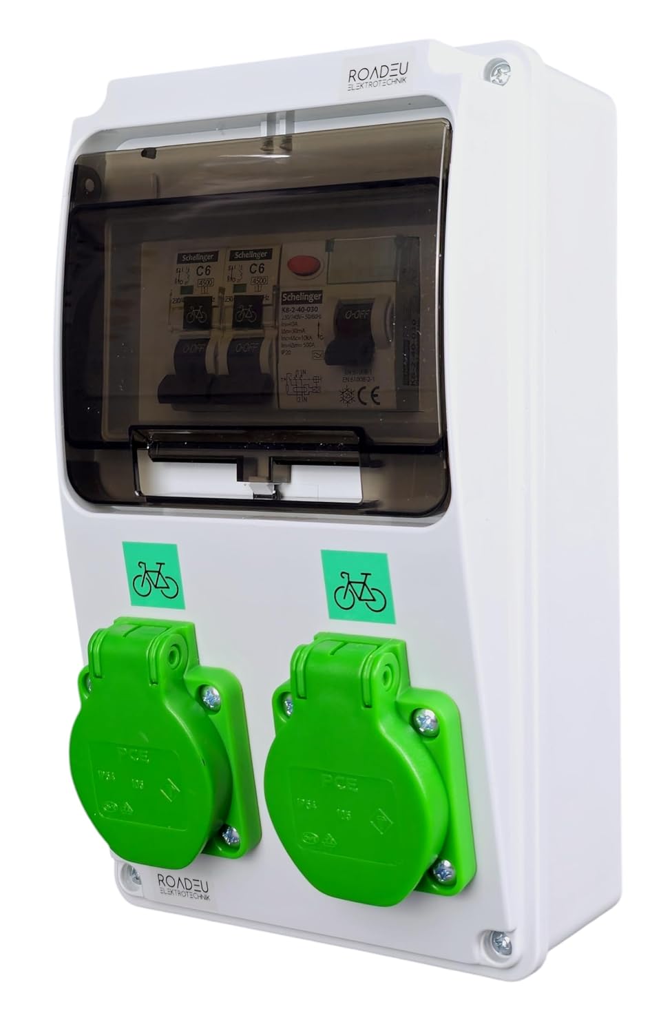 E-Bike Ladestation Wandverteiler | 2x grüne E-Bike-Steckdose | FI-Schutzschalter Typ A 30mA & Leitungsschutzschalter C6A