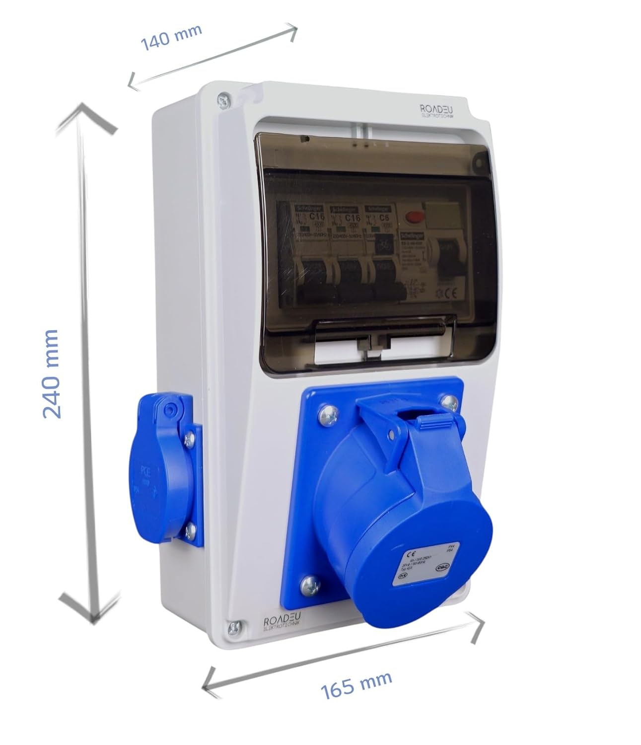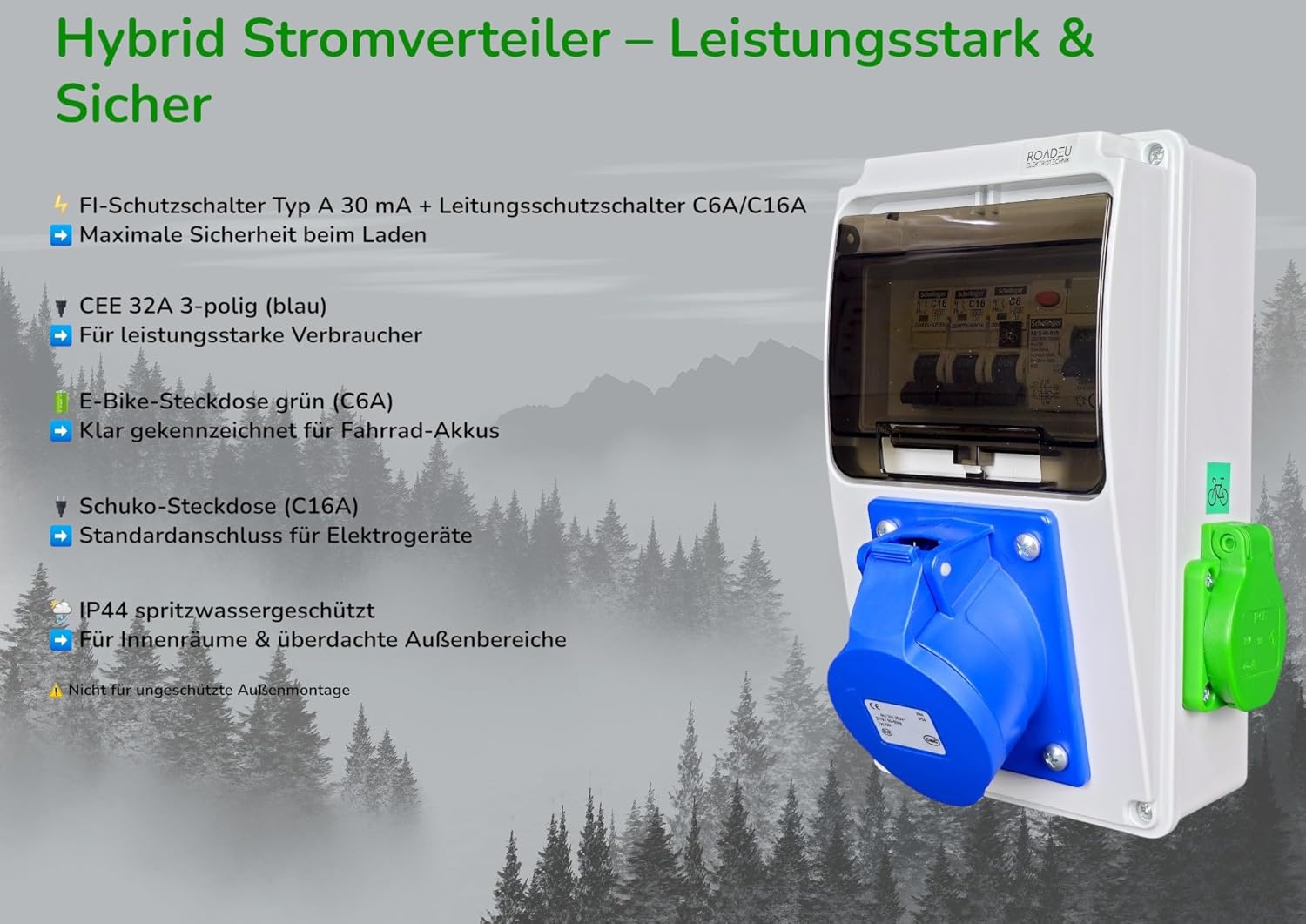 ⚡ Individuell abgesichert: Jede Steckdose mit eigenem Leitungsschutzschalter – C32A für CEE, C16A für Schuko und C6A für E-Bike.