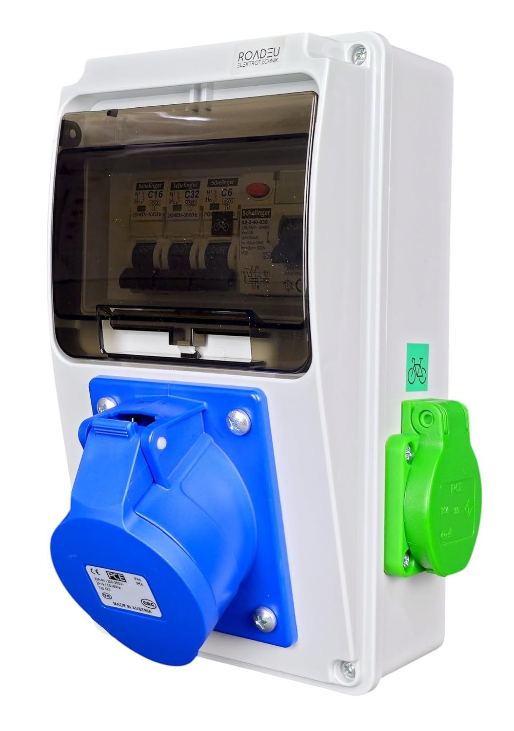 🔌 Hybrid Stromversorgung: Ausgestattet mit 1x CEE 32A 3-polig (blau), 1x Schuko-Steckdose (C16A) und 1x grün markierter E-Bike-Steckdose (C6A) – vielseitige Lösung für Haushalt, Werkstatt & Gewerbe.