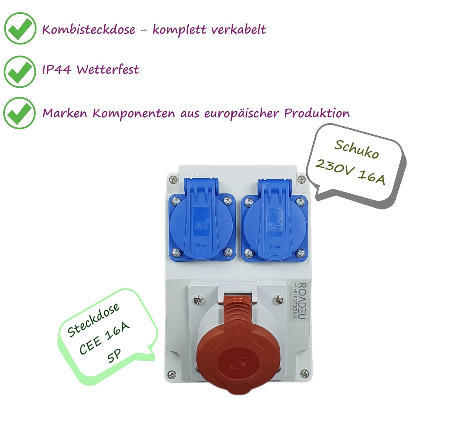 - VIELSEITIGE BESTÜCKUNG FÜR STARKSTROM: Das Gerät ist mit einer CEE 16A 5P Starkstrom-Steckdose sowie 2 x 200/250V 16A Schuko Steckdosen ausgestattet,