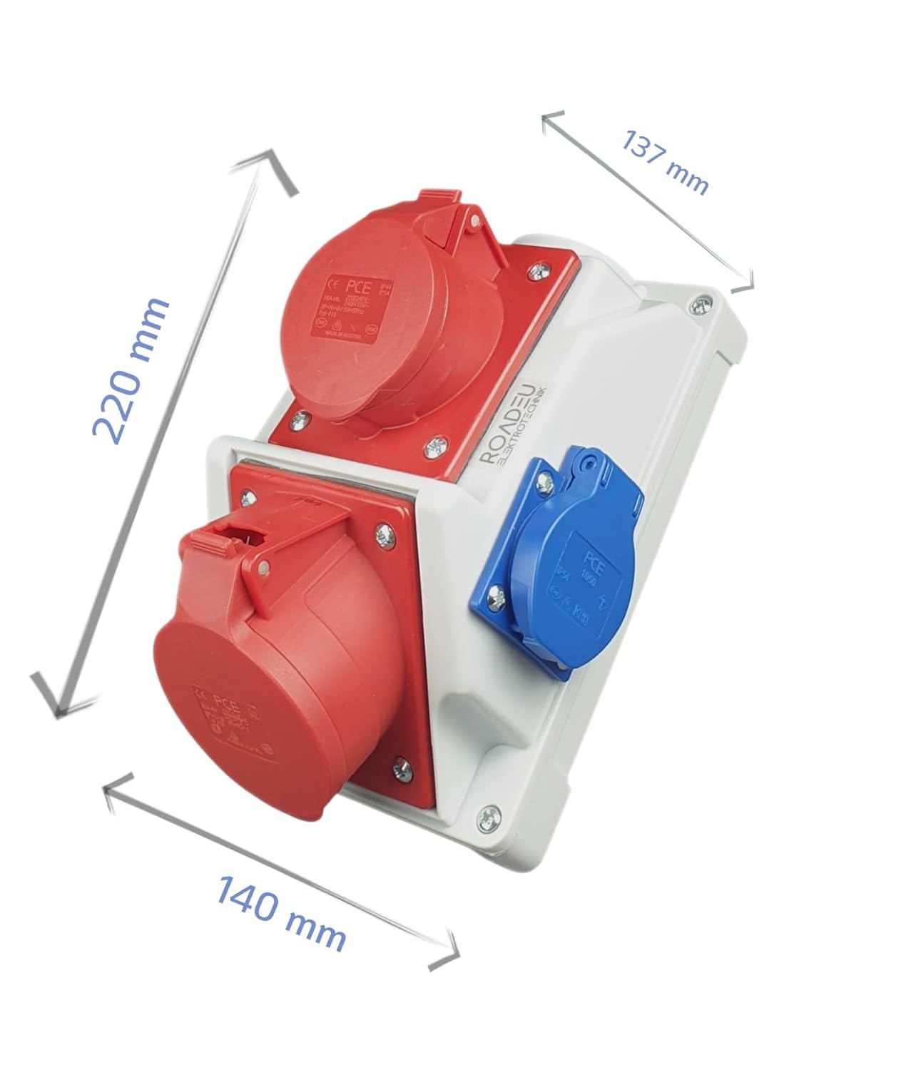 Hochwertige externe PCE Steckdosen. Der baustromverteiler 32A und 16A ist vorverdrahtet und anschlussfertig. Die Verteilerkasten enthält auch eine PG16-Kabelverschraubung.