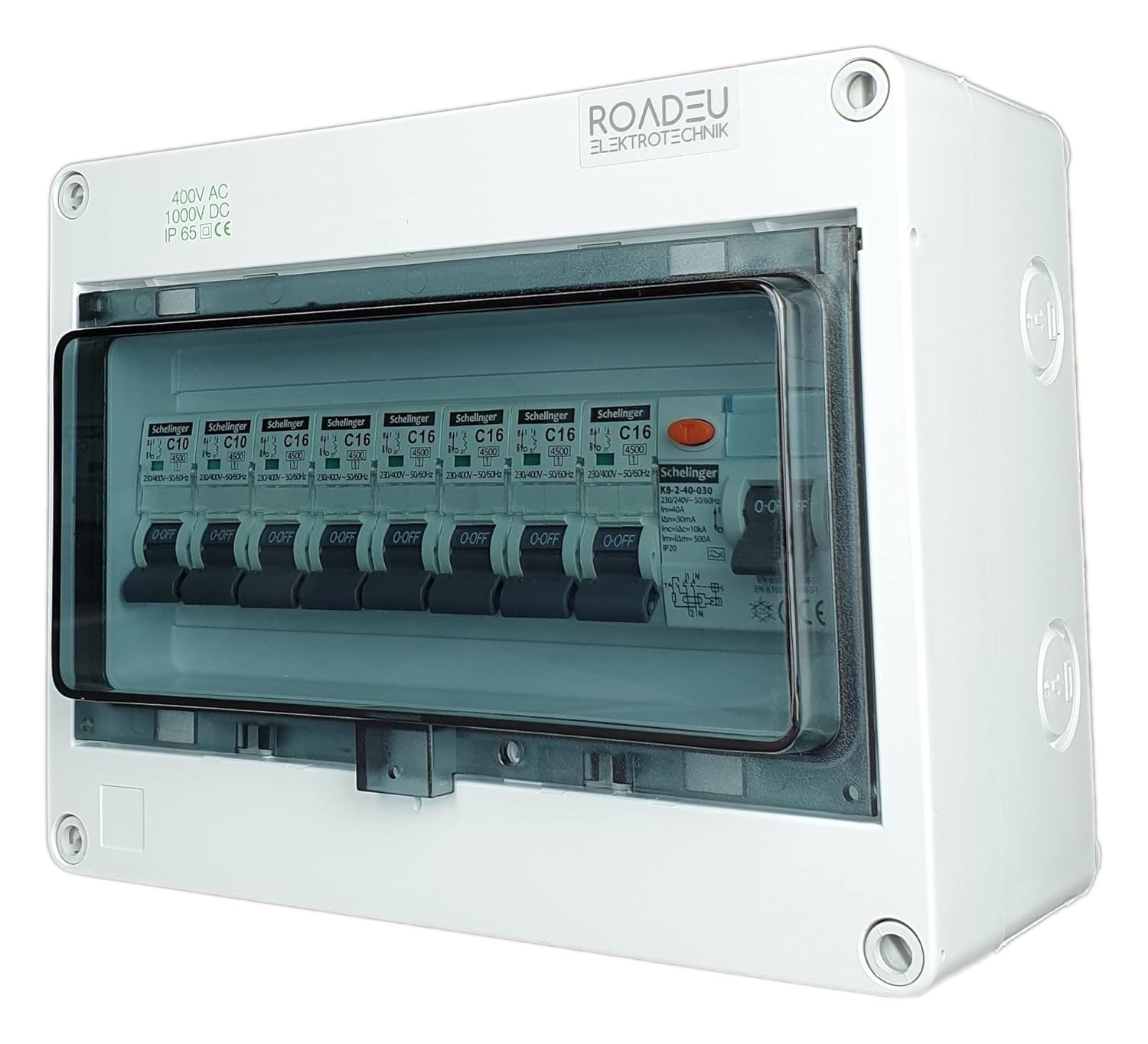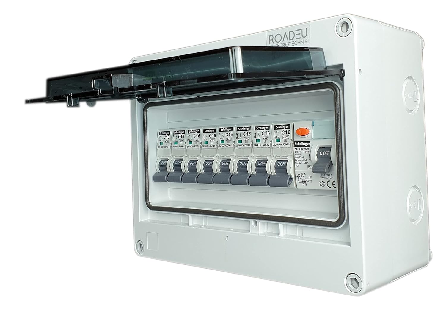 DER VERTEILERKASTEN AUFPUTZ ABSICHERUNG: umfasst 1x Fehlerstromschutzschalter 40A 30mA Typ A/AC, 6x Sicherungsautomat 16A 1P C und 2x Sicherungsautomat 10A 1P C. Alle Komponenten sind durch Herstellerzertifikate wie TÜV für ihre Qualität und Sicherheit bestätigt.