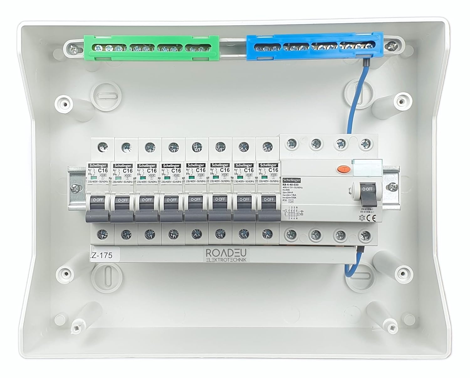 VERTEILERKASTEN AUFPUTZ ABSICHERUNG umfasst 1x Fehlerstromschutzschalter 40A 30mA Typ A/AC 4P, 8x Sicherungsautomat 16A 1P C. Herstellerzertifikate: TÜV. Der Anschluss von Überstromschutzschaltern erfolgt durch Trennung der Phasen, daher ist eine 3-phasige Stromversorgung erforderlich, um maximale Sicherheit zu gewährleisten.