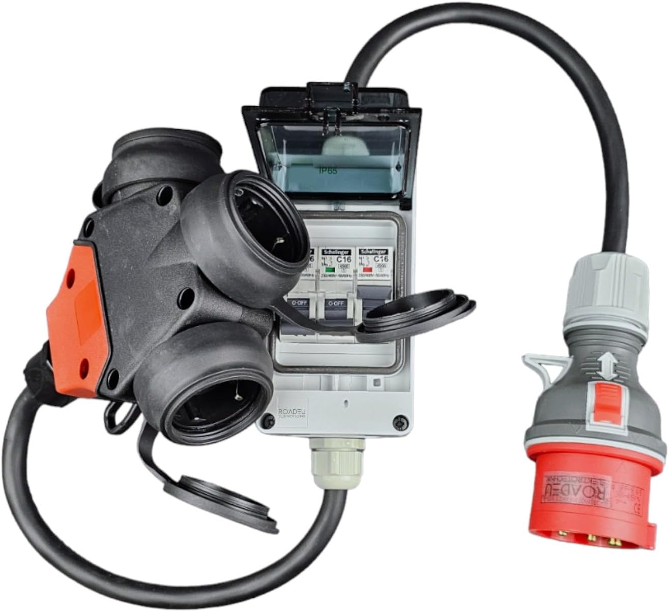 Starkstrom Adapter, CEE Stecker 16A, 380V auf 220V Adapter, 3X 220V Schuko Kupplung, Sicherungskasten mit 3X Leitungsschutzschalter 16A C, Gummi Starkstromkabel 1 Meter. Adapter 16A auf 230V