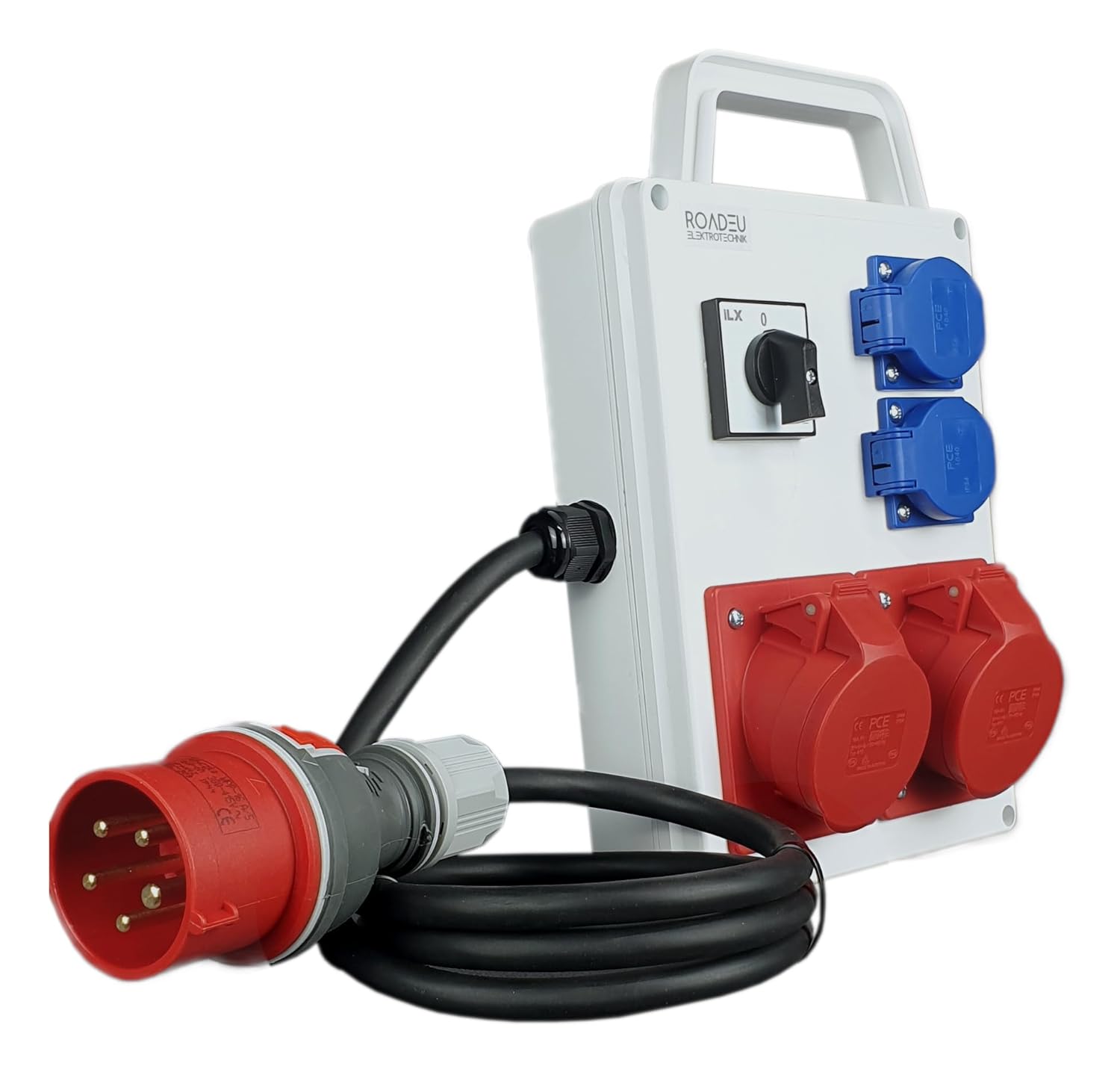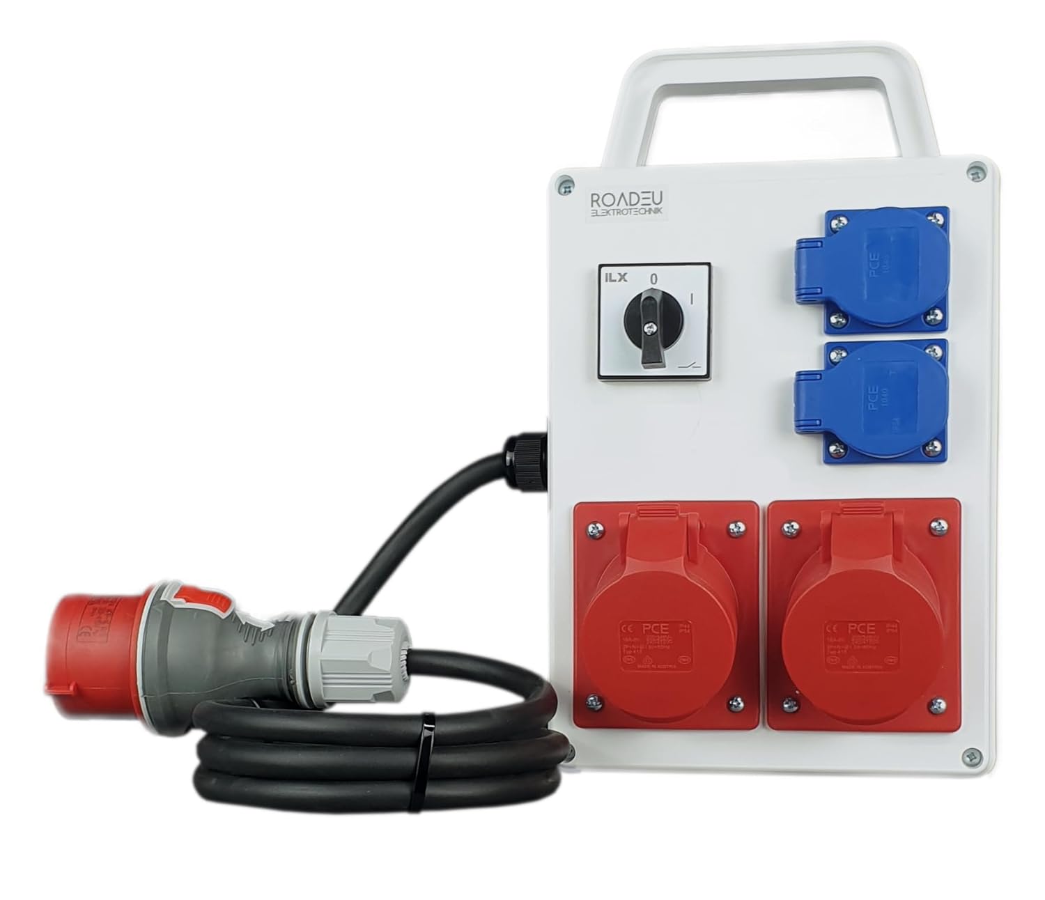 Bestückung: 2x 16A 5P 400V Starkstrom steckdose – 2x 200/250V 16A IP44 Schuko. Hauptschalter 0-1 32A. Stecker 16A 5P. Kabel 5×2,5 – 1m