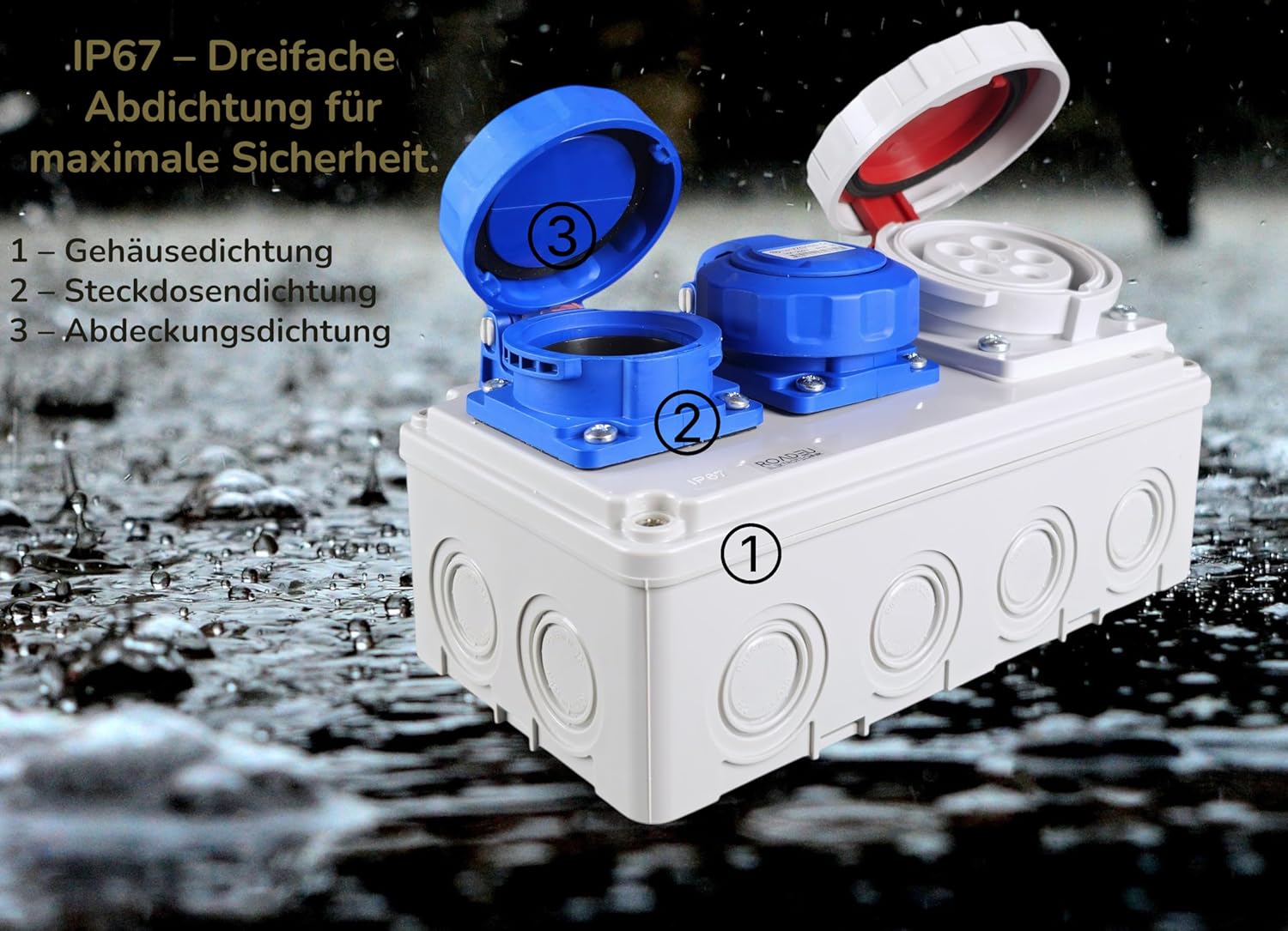 💧 IP67 Schutzklasse – staubdicht und wasserdicht dank dreifacher Abdichtung (Gehäuse, Steckdosen, Abdeckungen). Ideal für den sicheren Einsatz im Innen- und Außenbereich.
