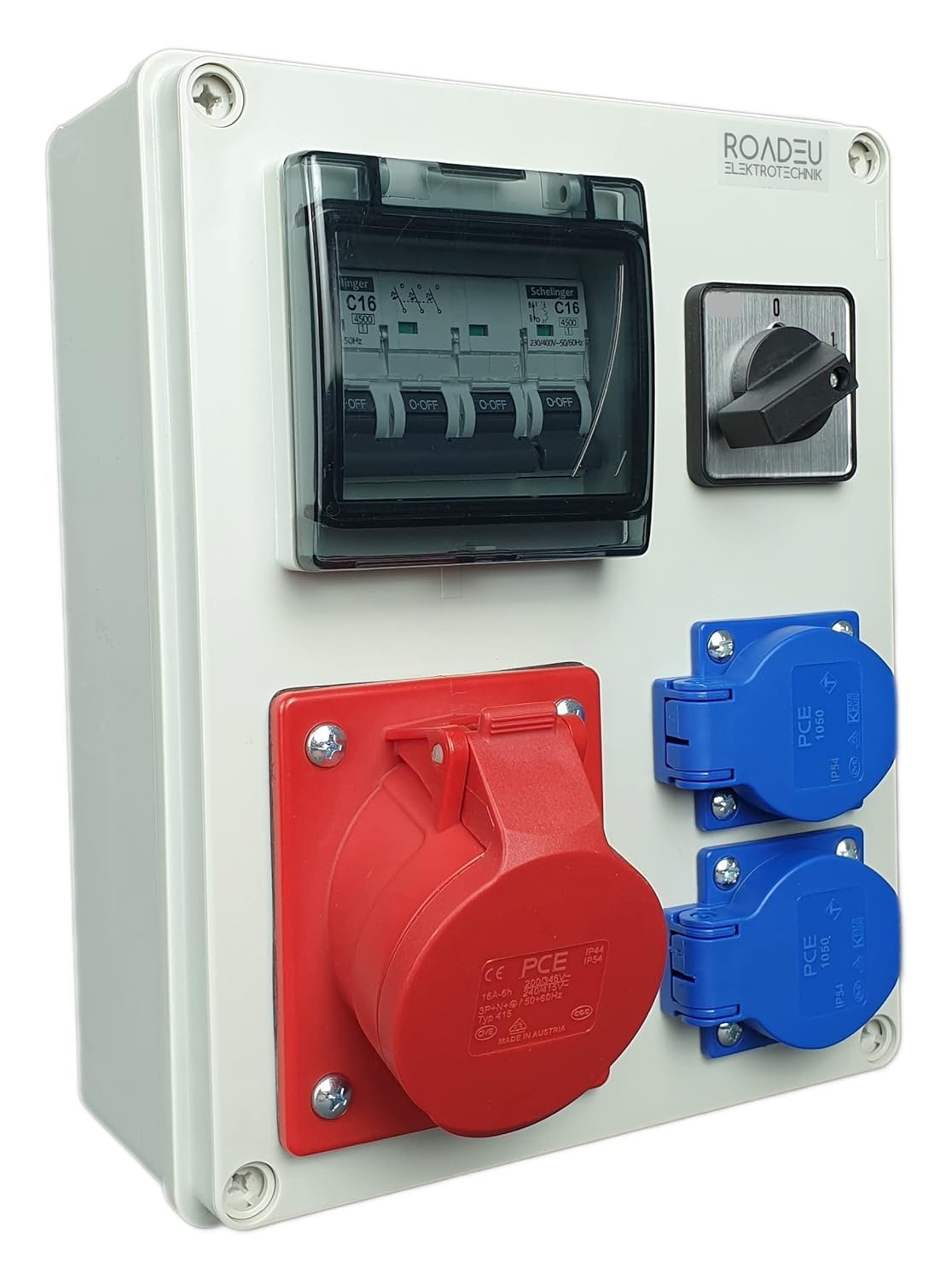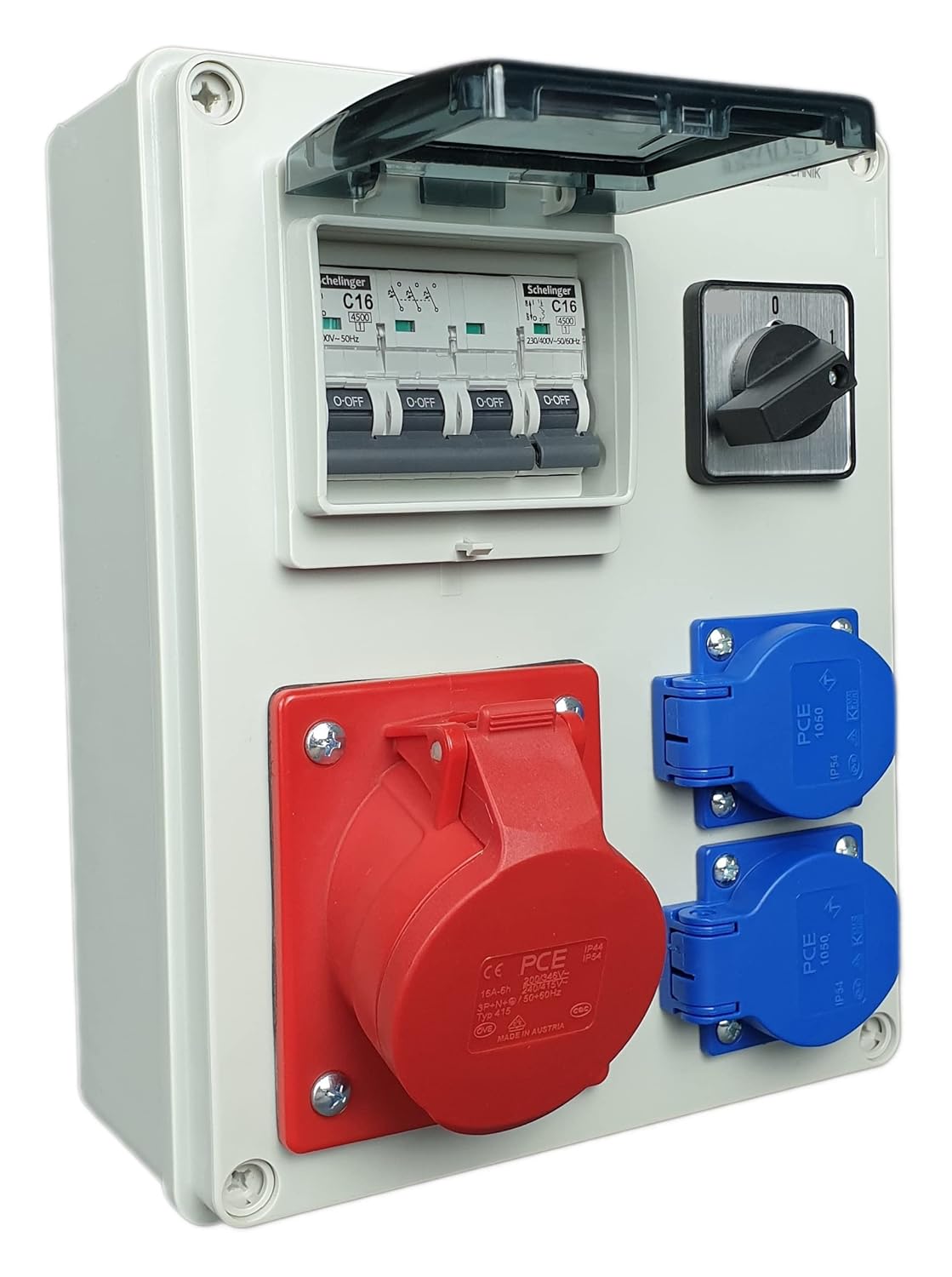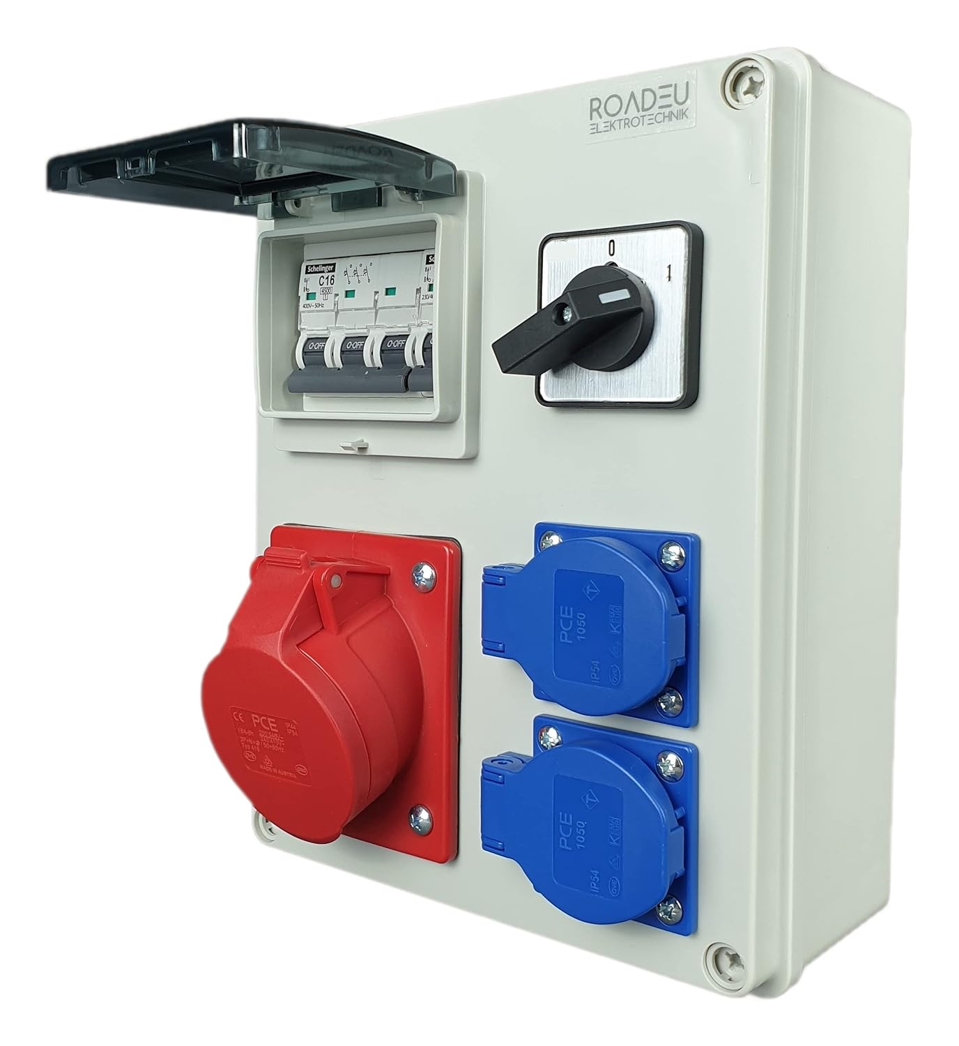 Hochwertige externe PCE Steckdosen mit Drehschalter und Leitungsschutzschalter. Der Stromverteiler ist vorverdrahtet und anschlussfertig. Die Verteilerkasten enthält auch eine PG16-Kabelverschraubung.