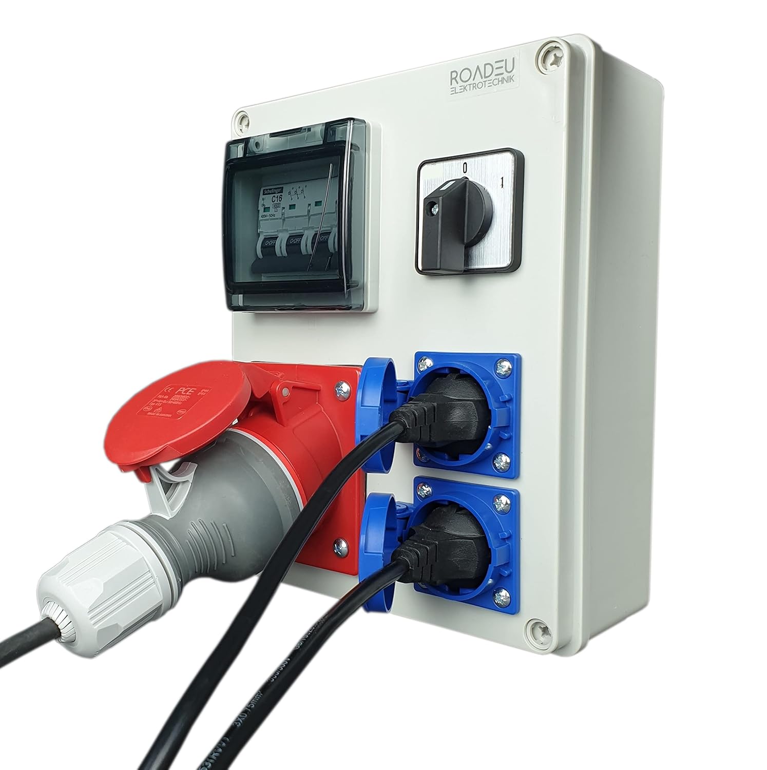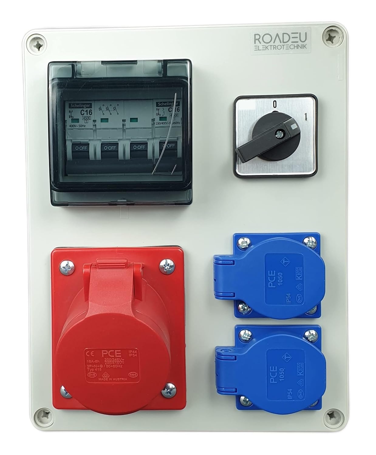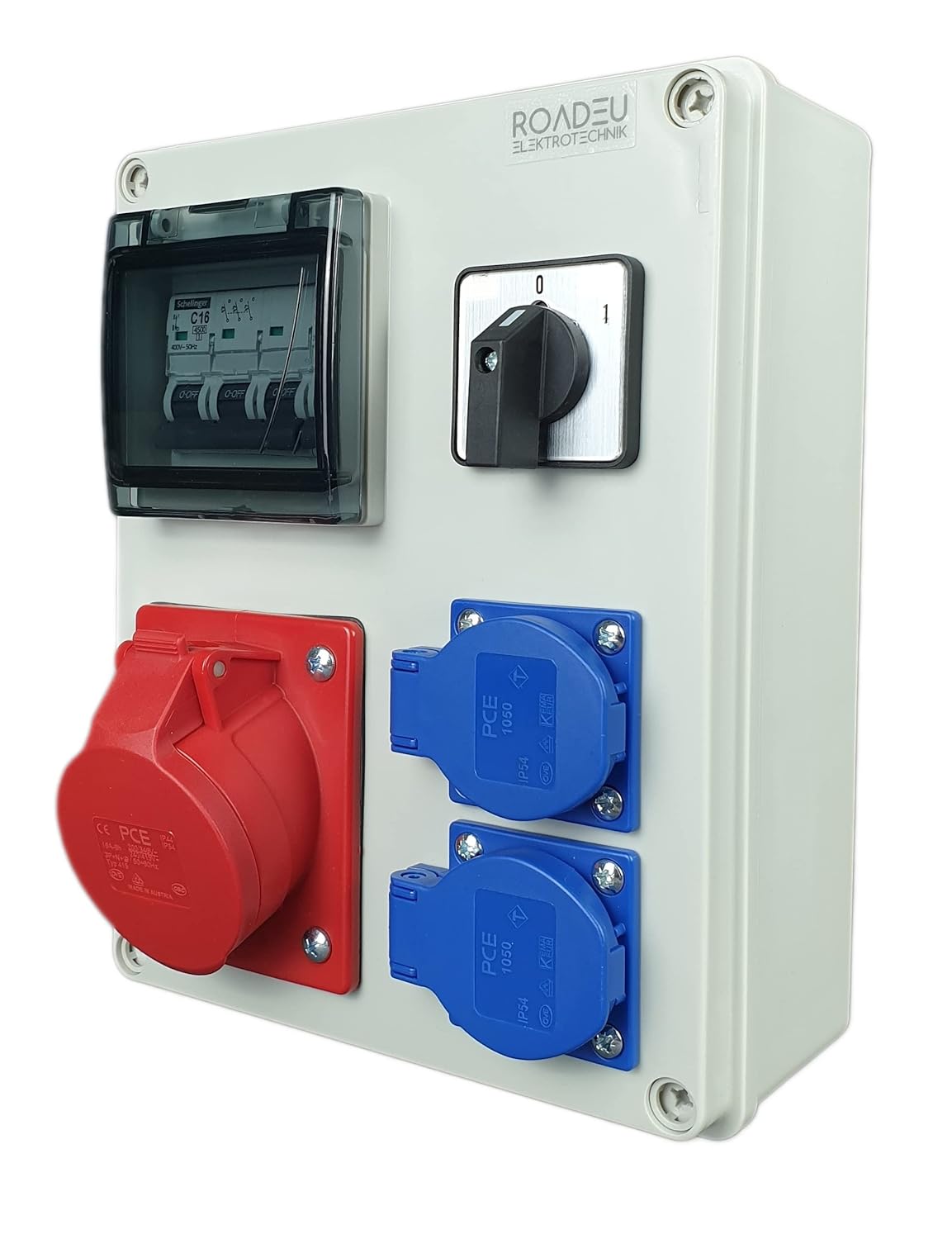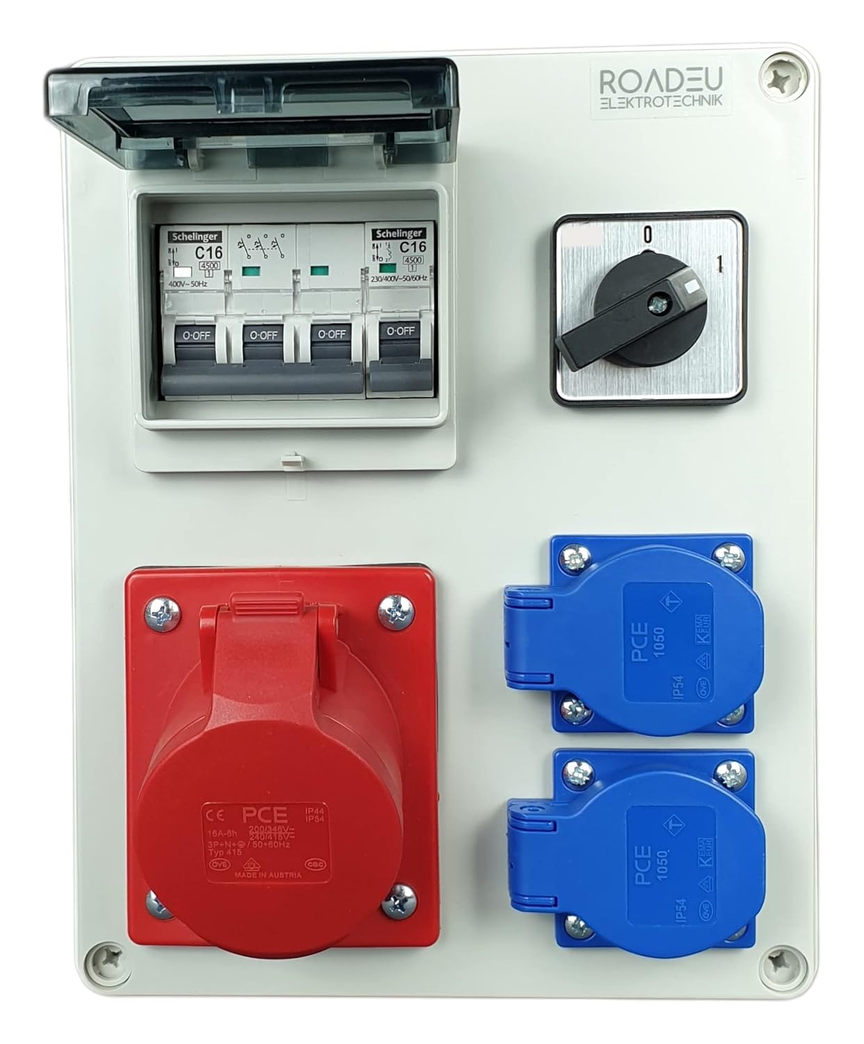 Hochwertige externe PCE Steckdosen mit Drehschalter und Leitungsschutzschalter. Der Stromverteiler ist vorverdrahtet und anschlussfertig. Die Verteilerkasten enthält auch eine PG16-Kabelverschraubung.