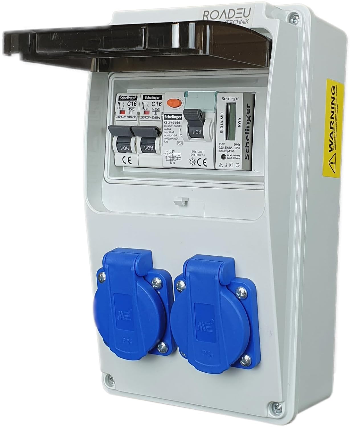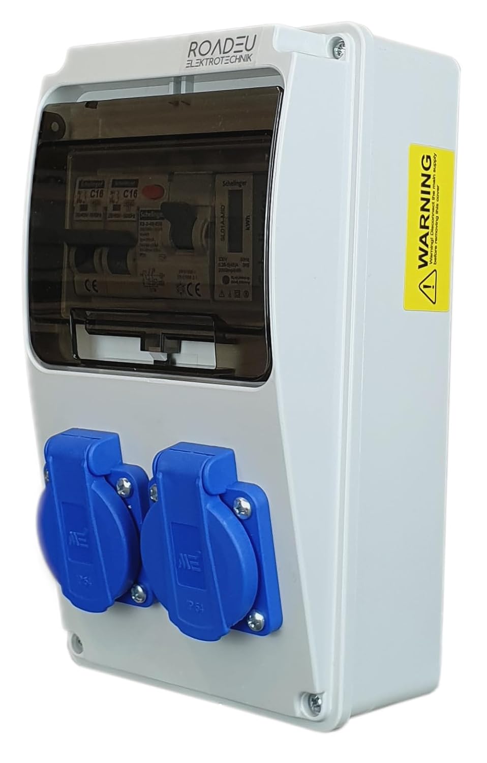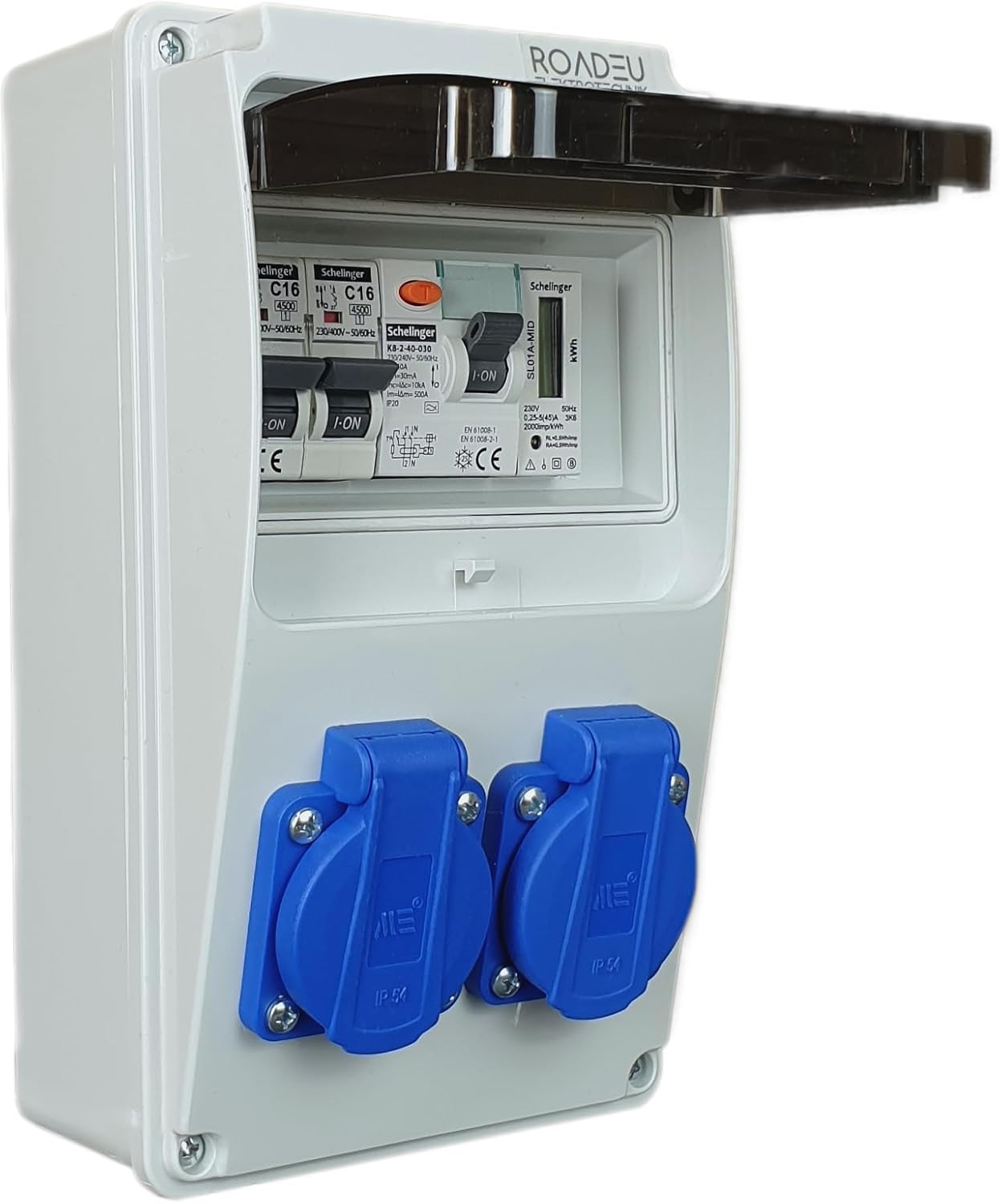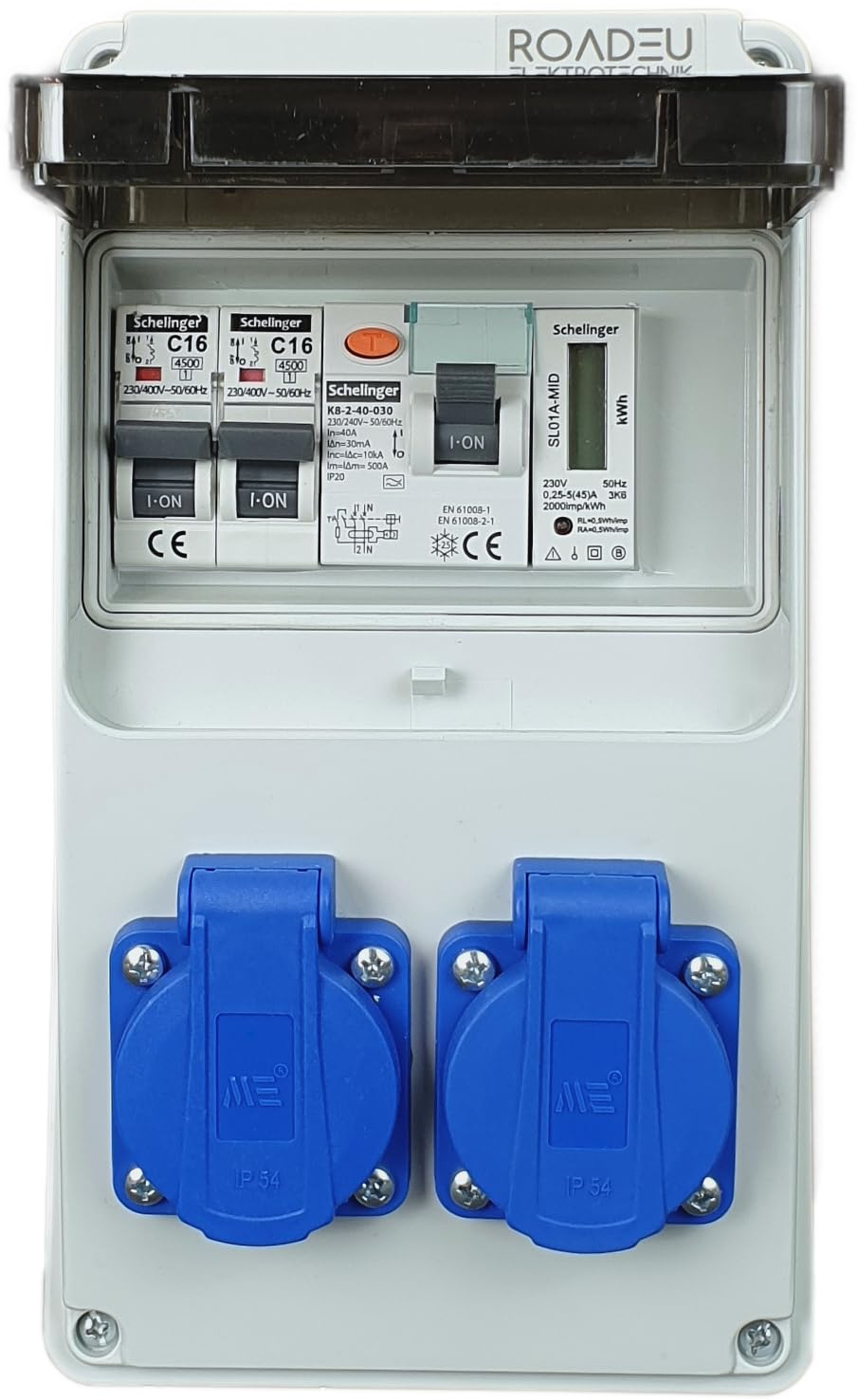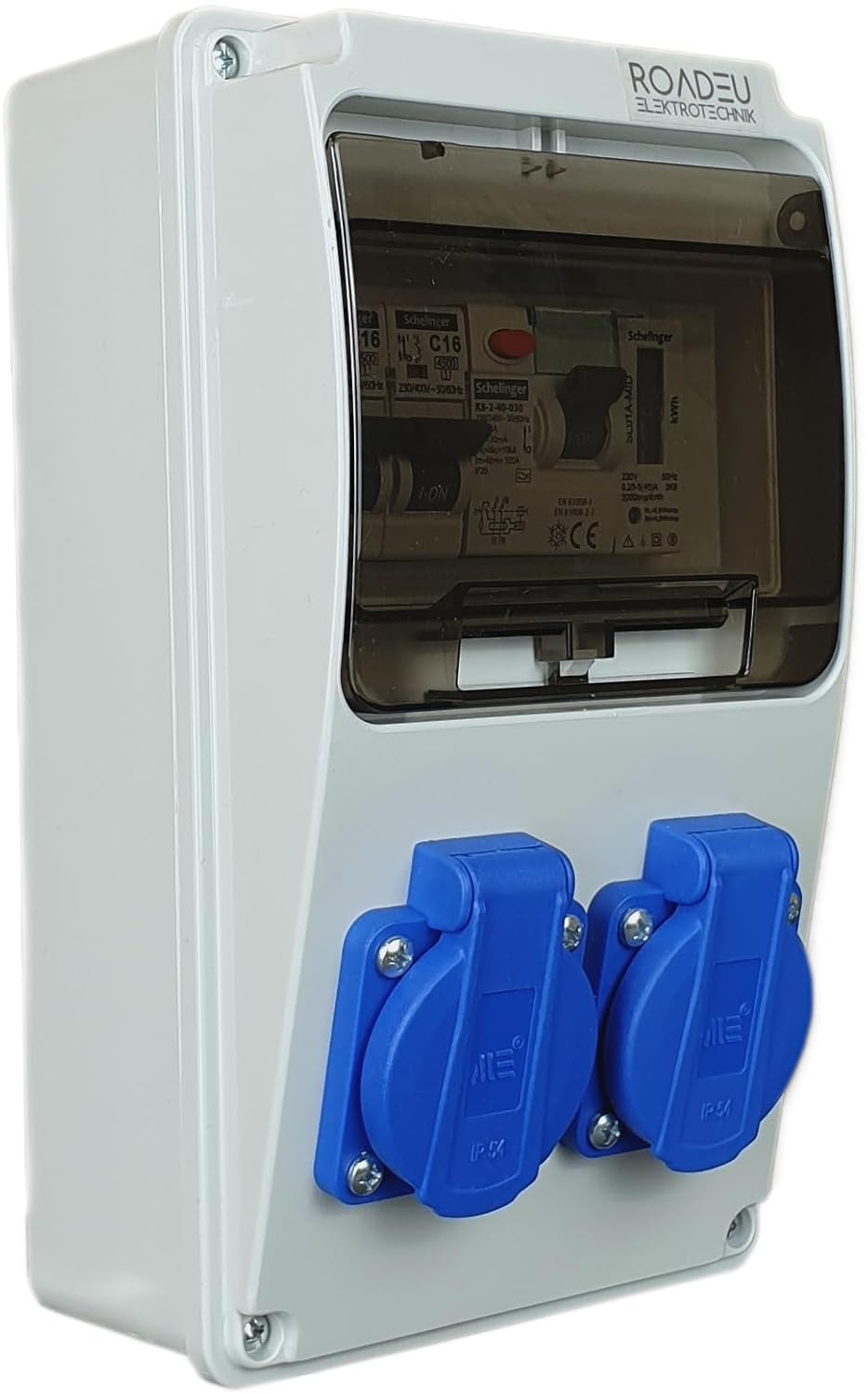 Bestückung: 2x 230V 16A IP44 Schuko dosen passend zu jedem 230V geradenstecker und winkelstecker. Verteiler ist für die Wandmontage vorgesehen.