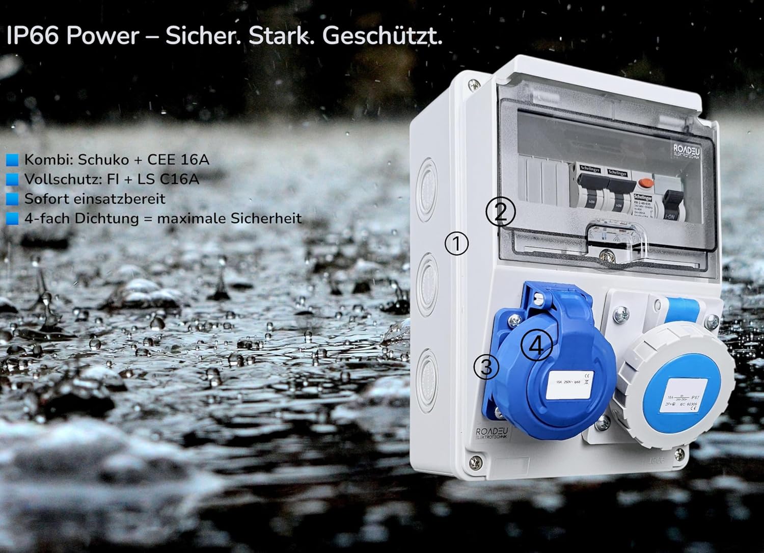 💧 IP66-Schutz mit 4-fach Dichtung – Komplett staubdicht und geschützt gegen starke Wasserstrahlen. Die vierfache Abdichtung (Gehäuse, Klappe, Steckdosen & Abdeckung) sorgt für höchste Sicherheit im Außenbereich.