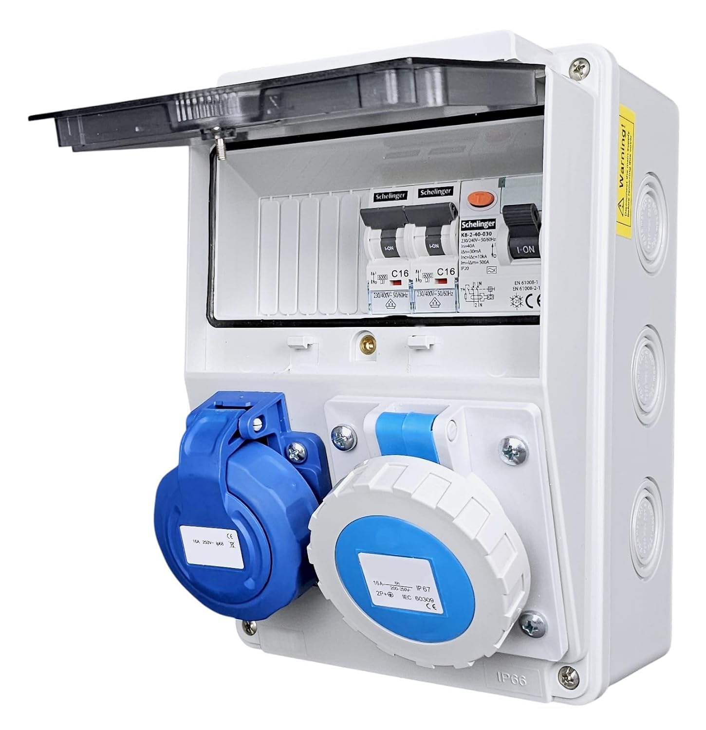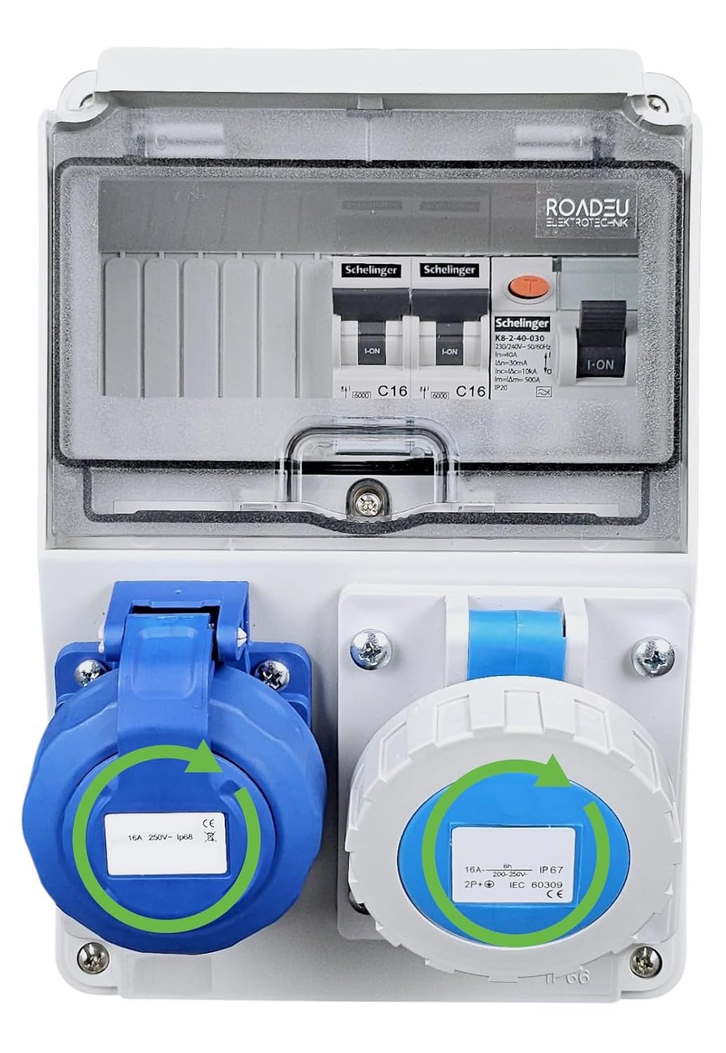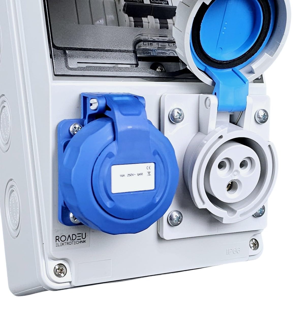 🔌 Praktische Kombination – 1x Schuko-Steckdose 230V 16A für Standardgeräte + 1x CEE-Steckdose 16A 3-polig 230V für professionelle Anwendungen. Vielseitige Stromversorgung in einem kompakten Verteiler.