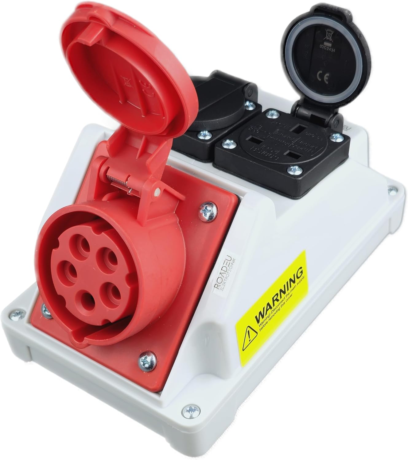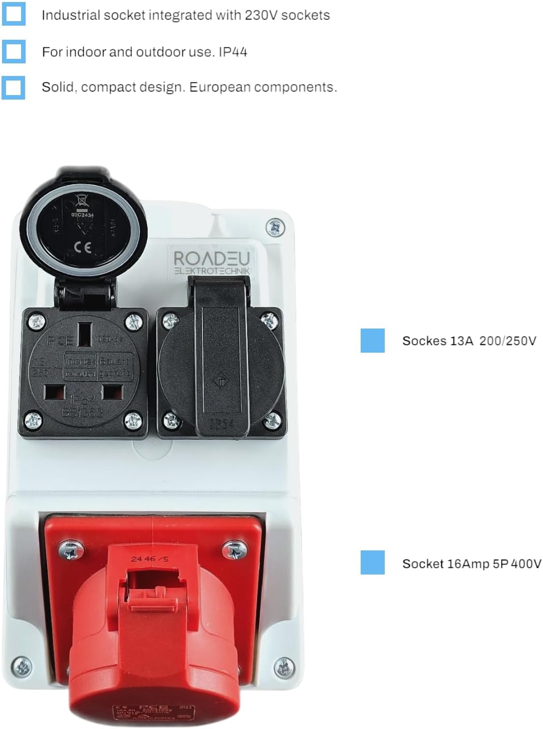 EU made 16Amp Socket 5P 400V and 2x 13Amp Socket 230V. The power distributor is pre-wired and ready to connect. The distribution box also contains a PG16 cable gland.