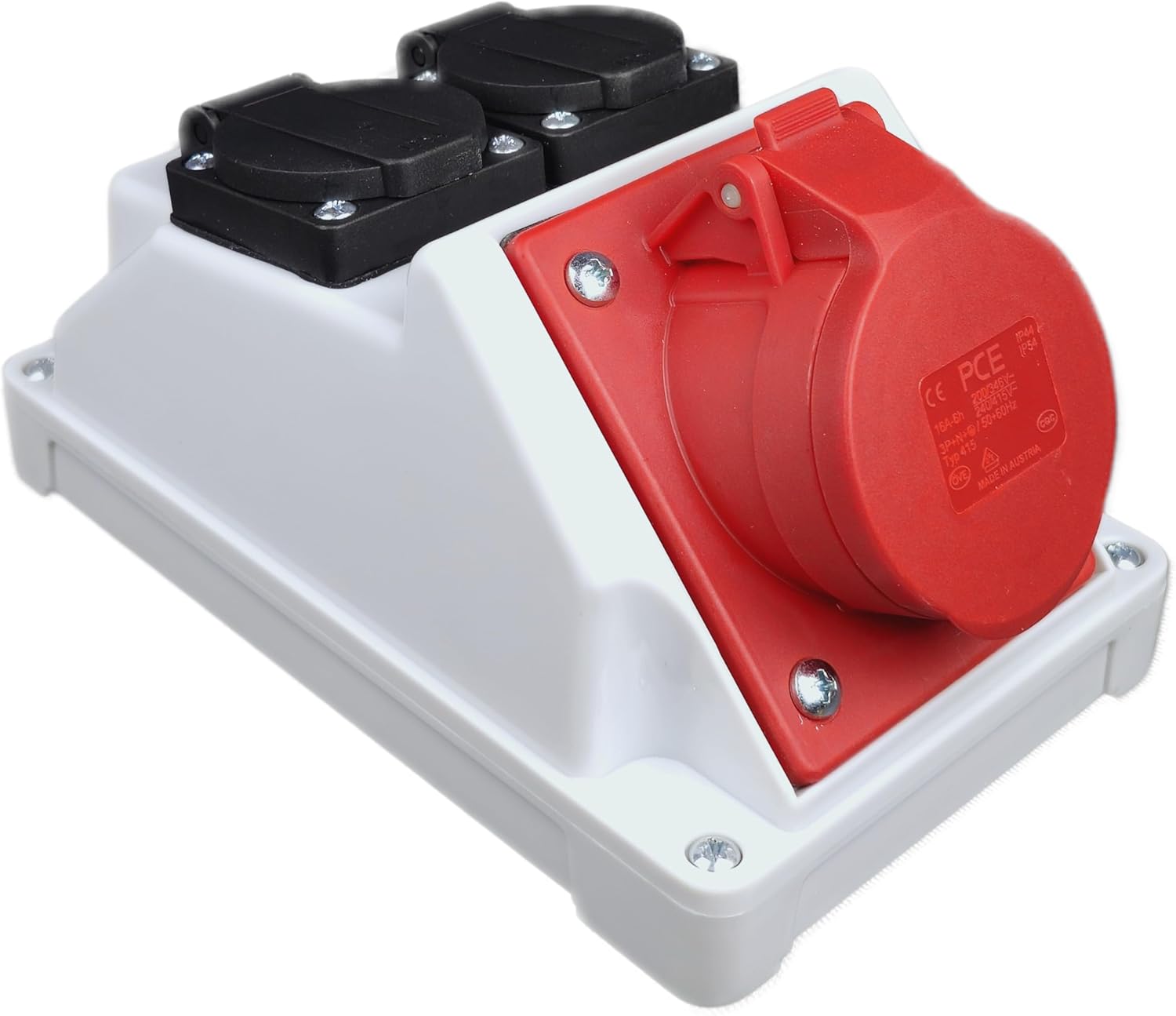 Equipped with 2x 200/250V 13A IP44 UK standard sockets. 1x CEE socket 16A 380/415V AC 3 Pole + Neutral + Earth. Housing provides high impact resistance and good weather insulation properties. It is also resistant against many chemicals.