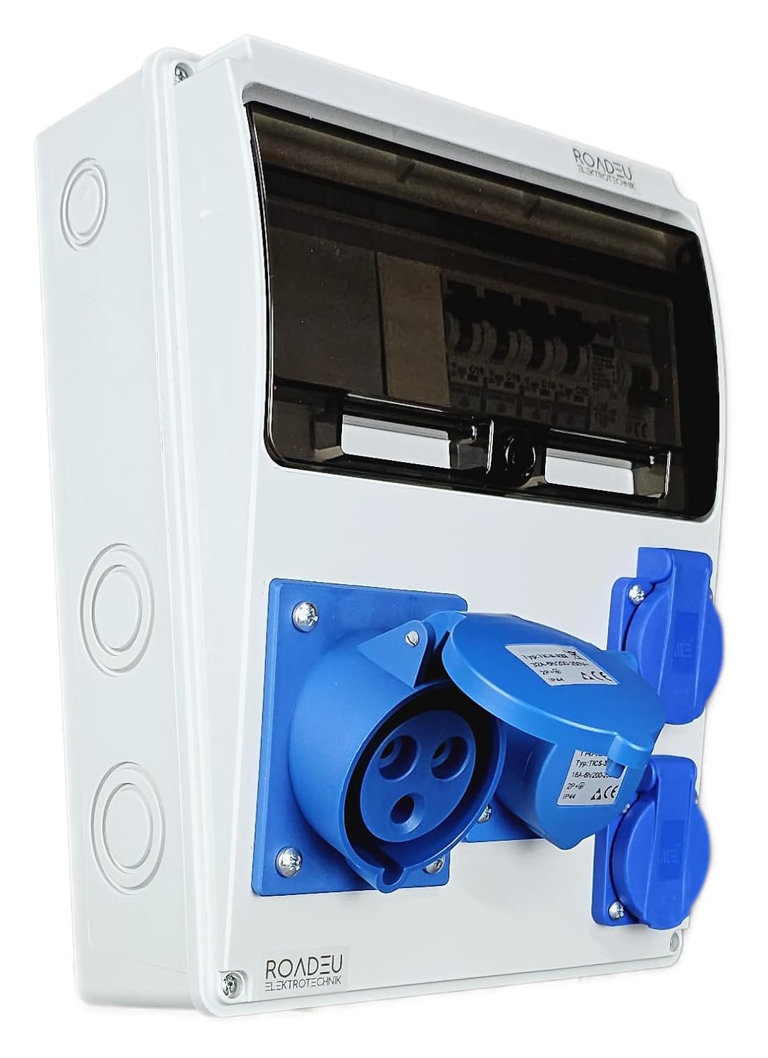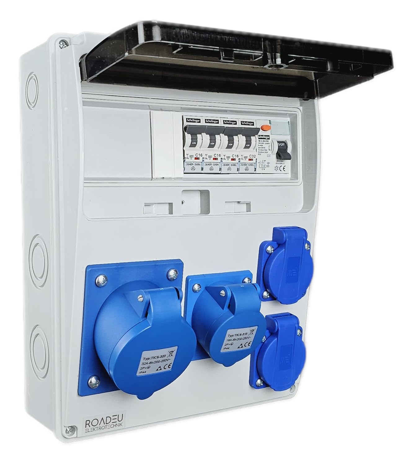 🔌 CONNEXIONS POLYVALENTES – 1x prise CEE 32A, 1x prise CEE 16A et 2x prises 230V avec clapets IP44. Idéal pour brancher simultanément plusieurs machines et outils électriques.
