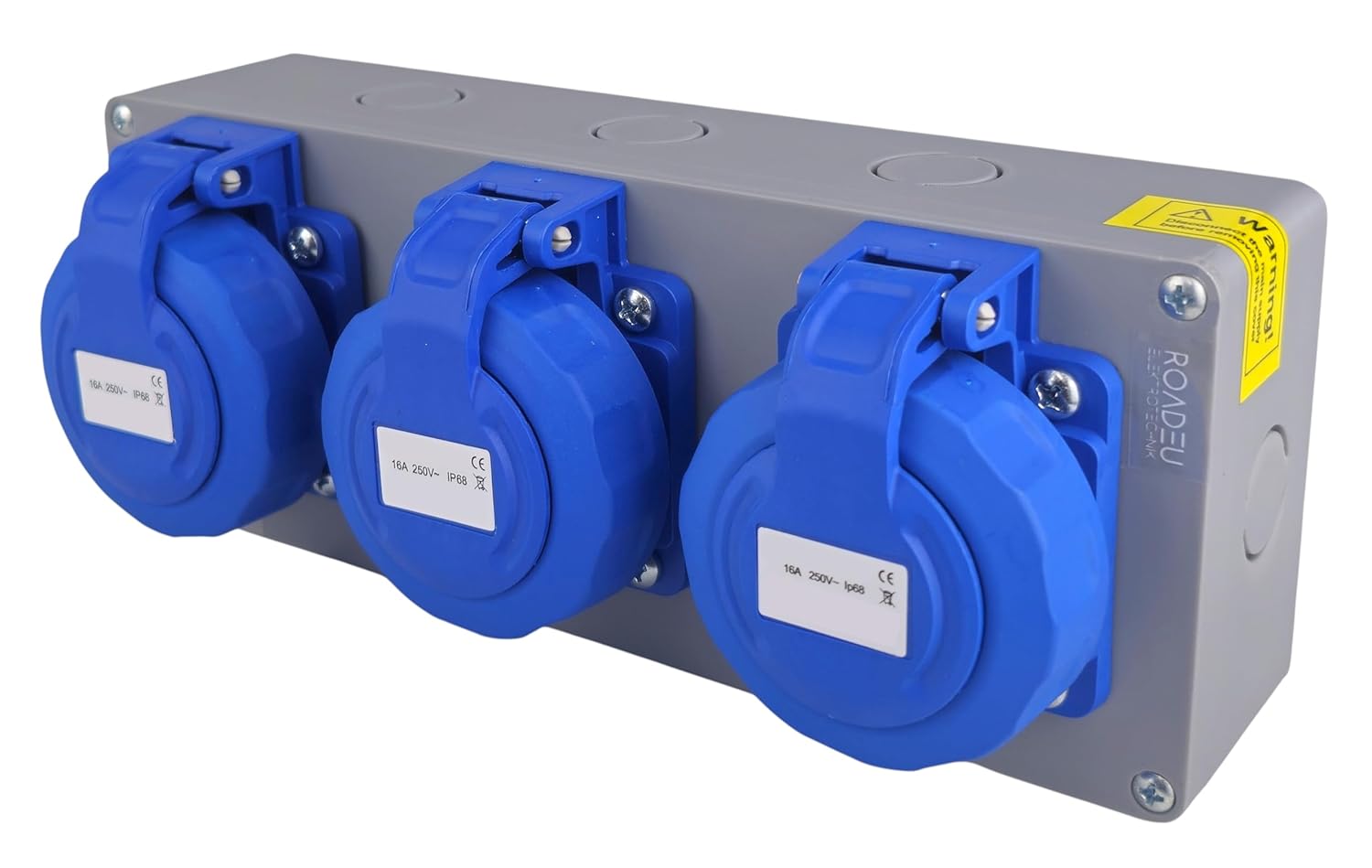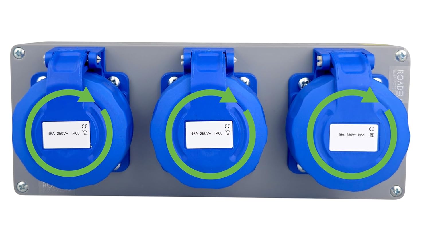 🔌 3 Prises 230V 16A (2P+T) avec Couvercles Vissables Coffret robuste équipé de deux prises au standard français, chacune protégée par un couvercle vissable avec joint pour une connexion sûre et fiable en intérieur comme en extérieur.