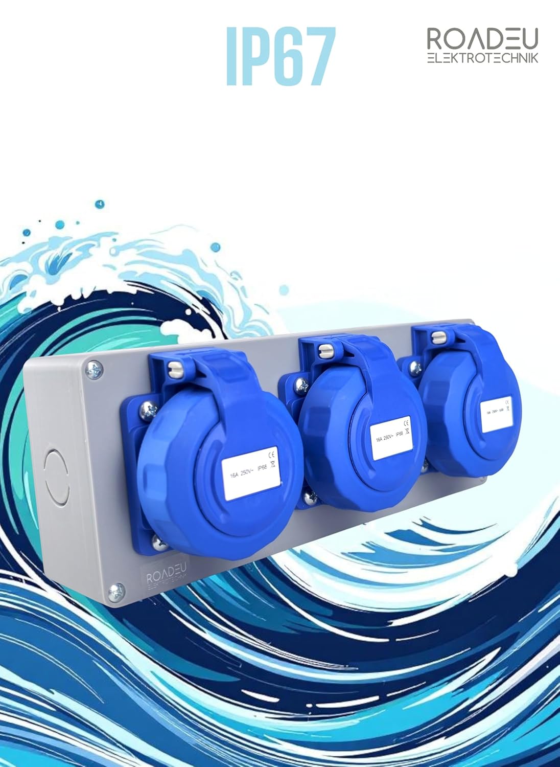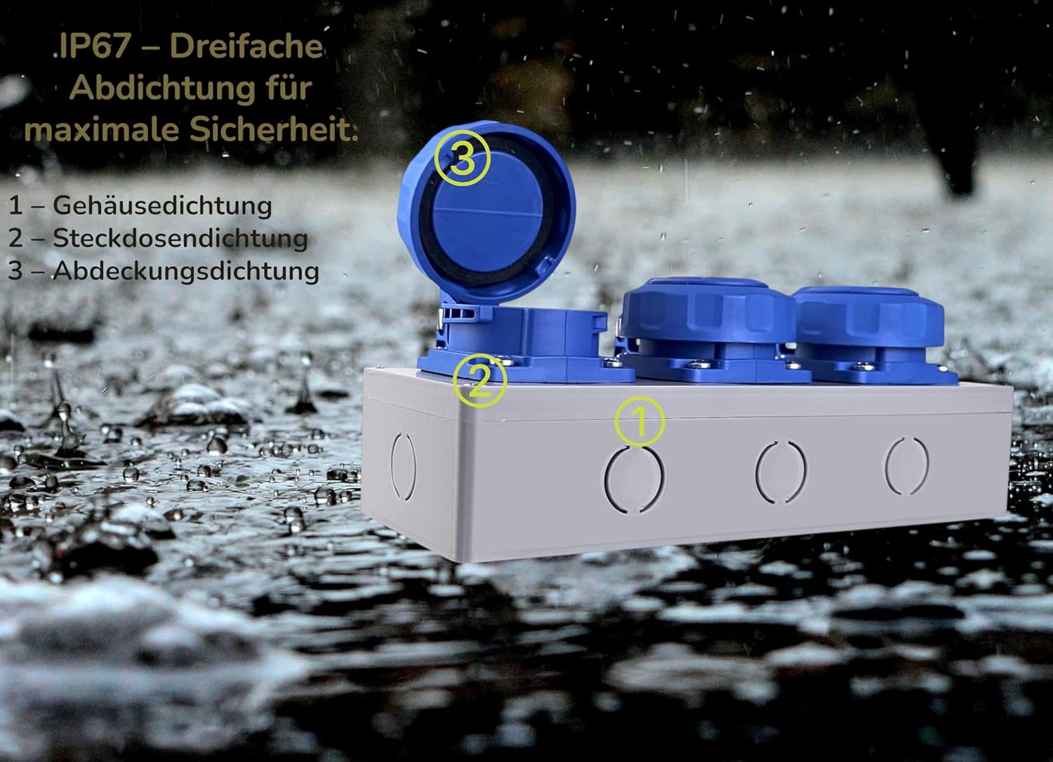 💧 IP67 – Étanchéité Totale grâce à la Triple Protection Protection intégrale contre la poussière et l’eau grâce à une triple étanchéité : boîtier, prises et couvercles. Idéal pour les environnements humides, la pluie, le nettoyage et les chantiers.